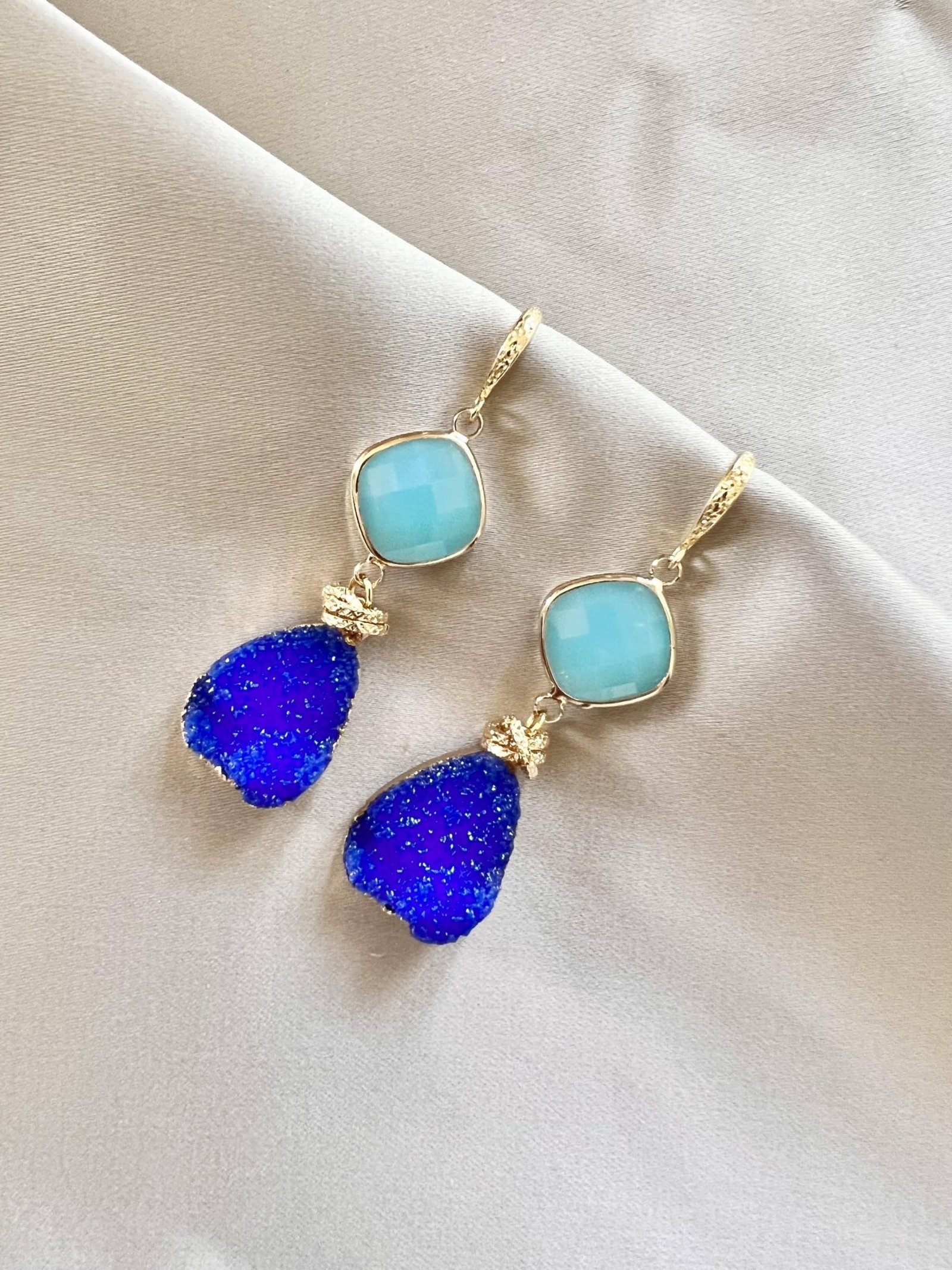 Vergulde oorhaakjes met aqua jade en royal blue druzy drops, afgewerkt met twisted goldplated ringetjes. Ze dragen heerlijk licht aan het oor.