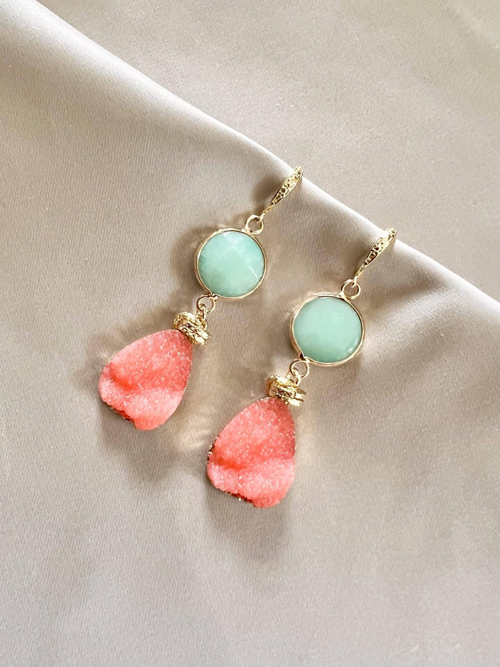 Goldplated oorhaakjes met azuurblauwe jade en peach druzy stone, afgewerkt met mooie goldplated ringetjes.
