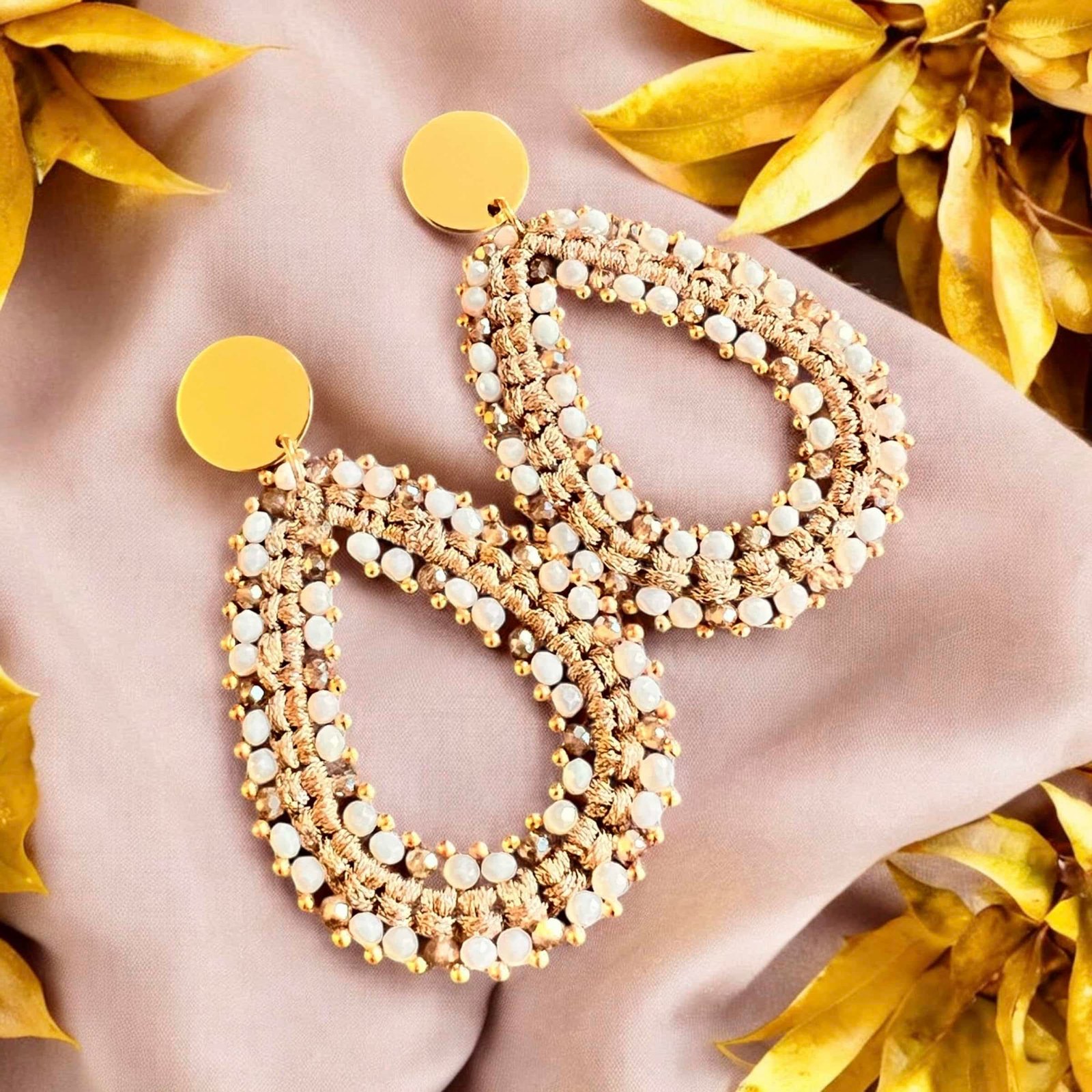 Tijdloze statement oorbellen van Folie à Lolie! Ronde vermeil (goud over zilver) oorstekers met crochet hangers in een mix van beige en off white crystals. Deze set draagt heerlijk licht aan het oor.