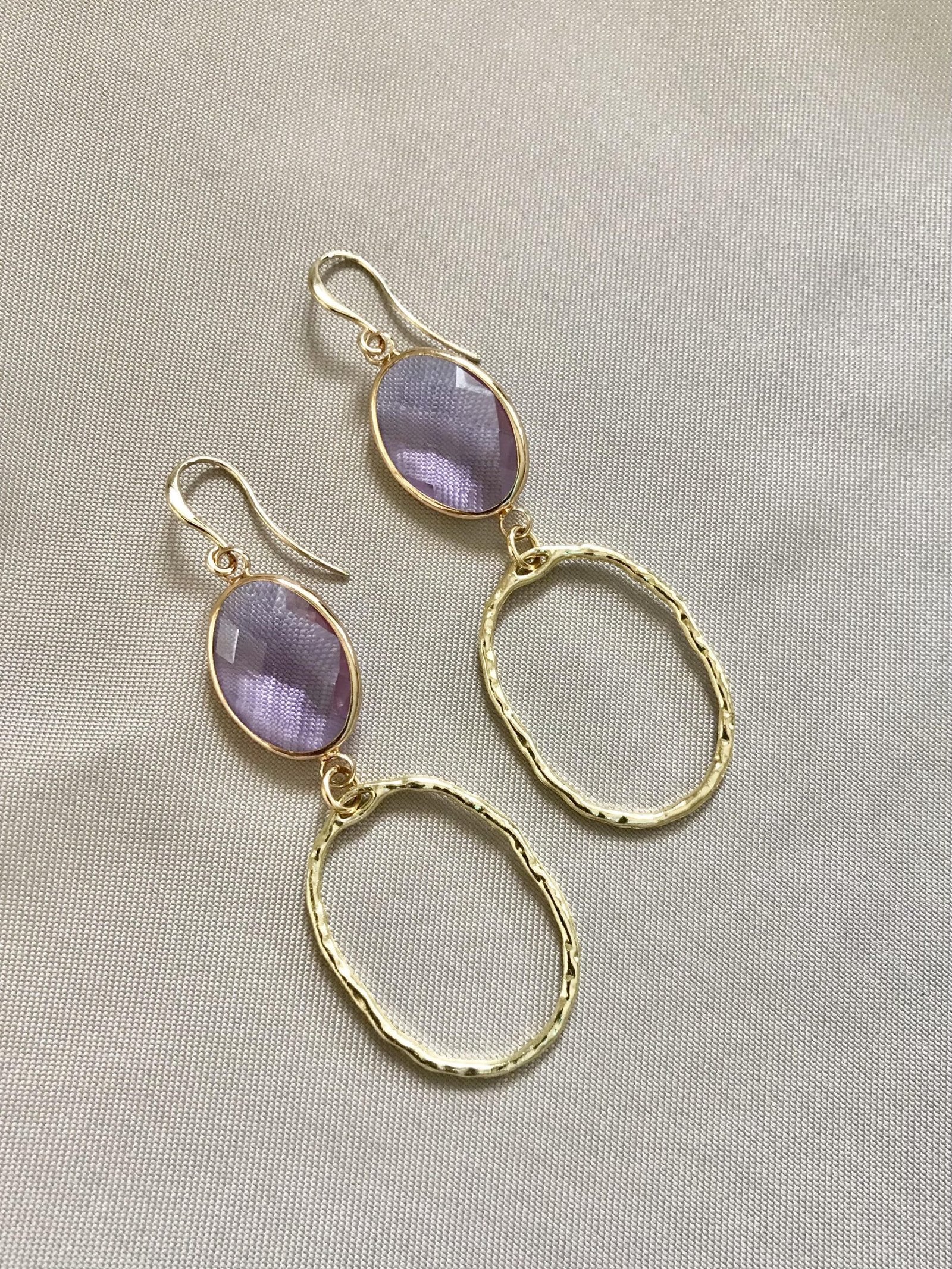 Lila glassteentjes met goudkleurige onregelmatige ovale hangers die heerlijk licht aan het oor dragen.