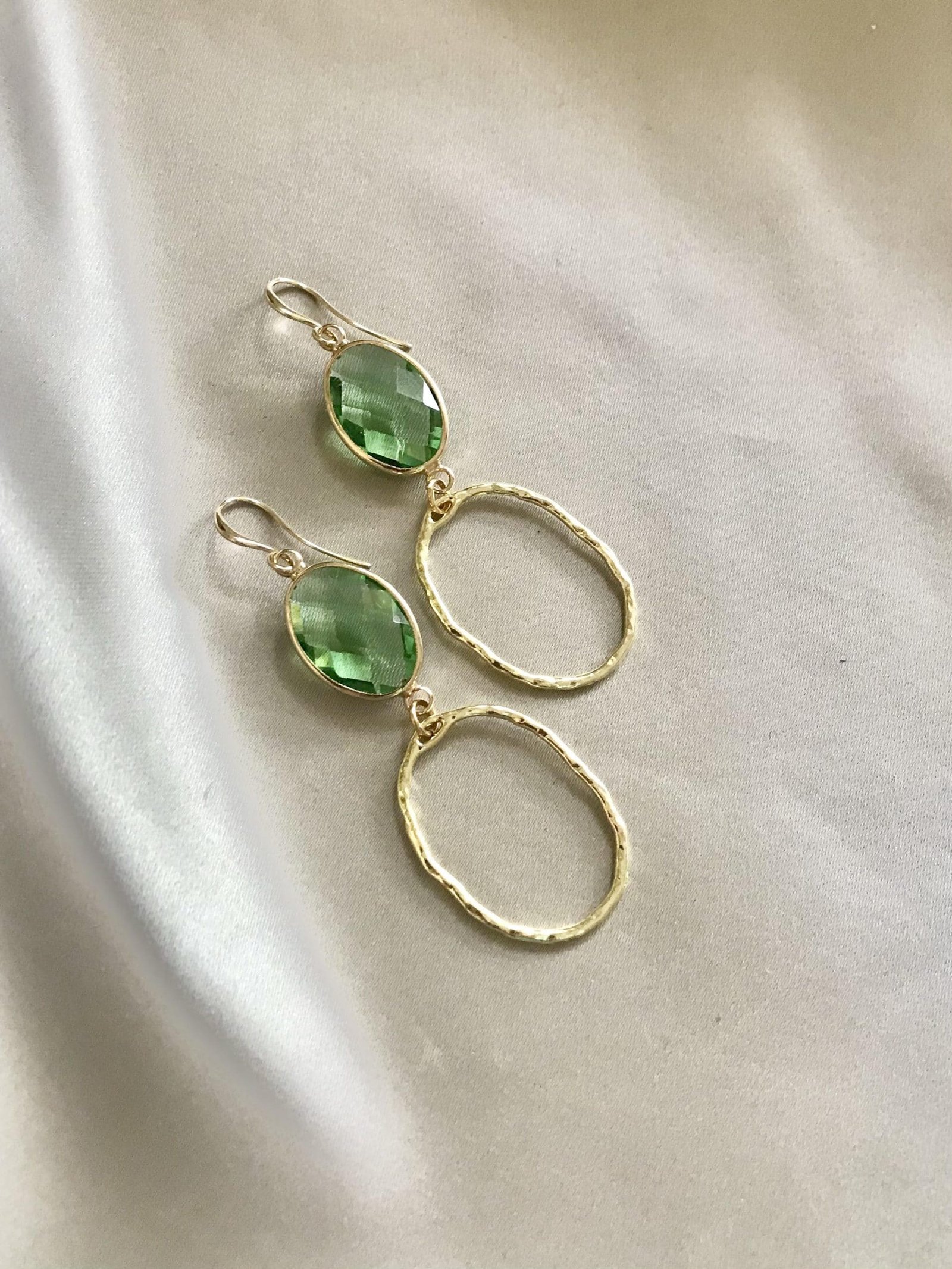 Wat een lekker fris kleurtje groen! Goldplated oorhaakjes met groene glasstenen en onregelmatige ovale hangers die heeeeeerlijk licht dragen.