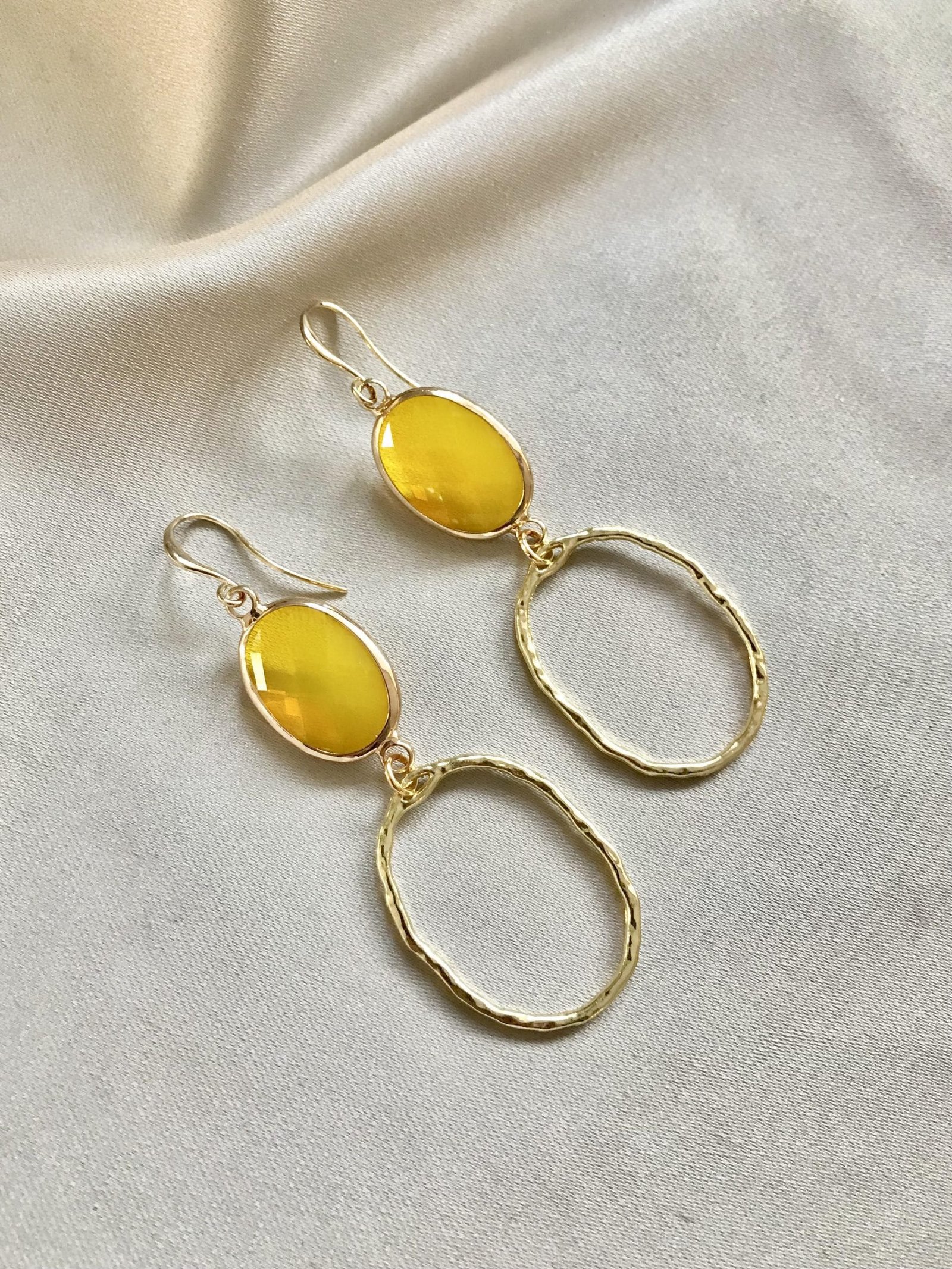Vergulde oorhaakjes met ovale gele glasstenen.