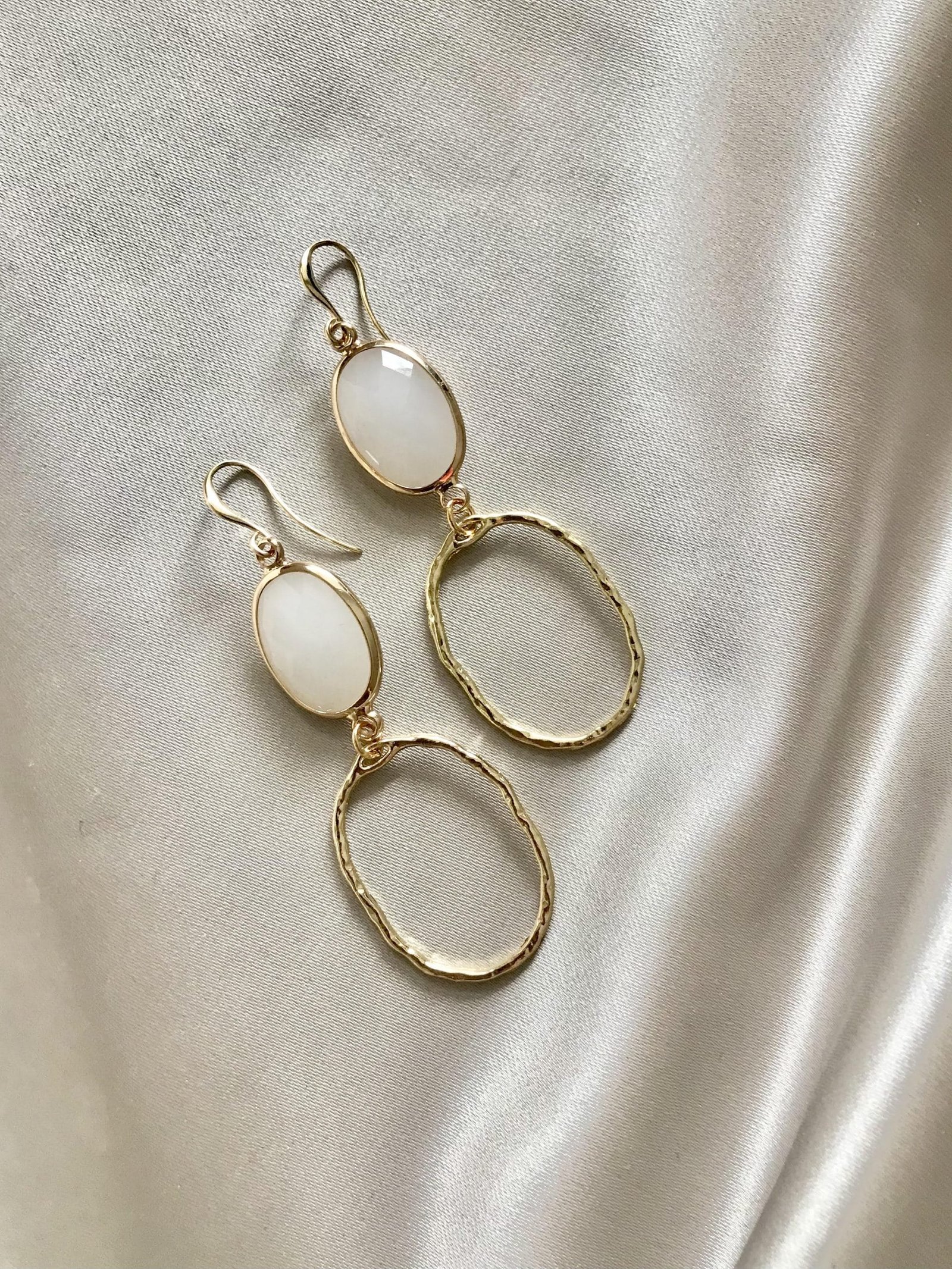 Vergulde oorhaakjes met Poederwitte Jade en onregelmatige goudkleurige ovale hangers die heerlijk licht dragen!