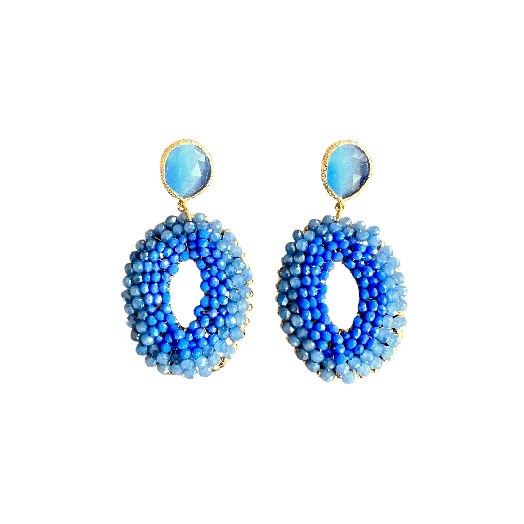 Wat een mooie blauwe eyecatchers! Goldplated blauwe catseye oorstekers (die goed op het oor zitten) gecombineerd met sky blue crystals.