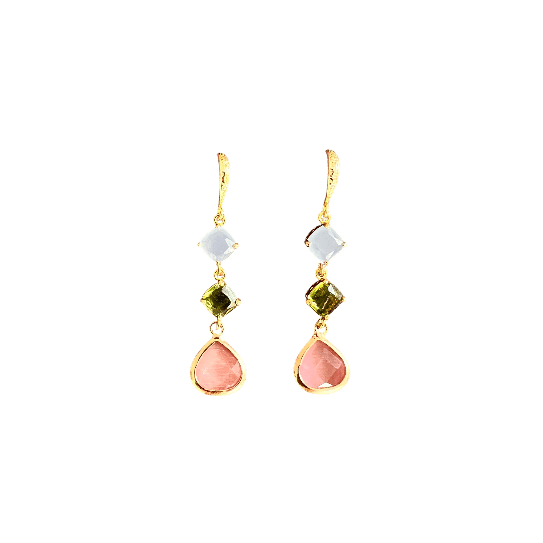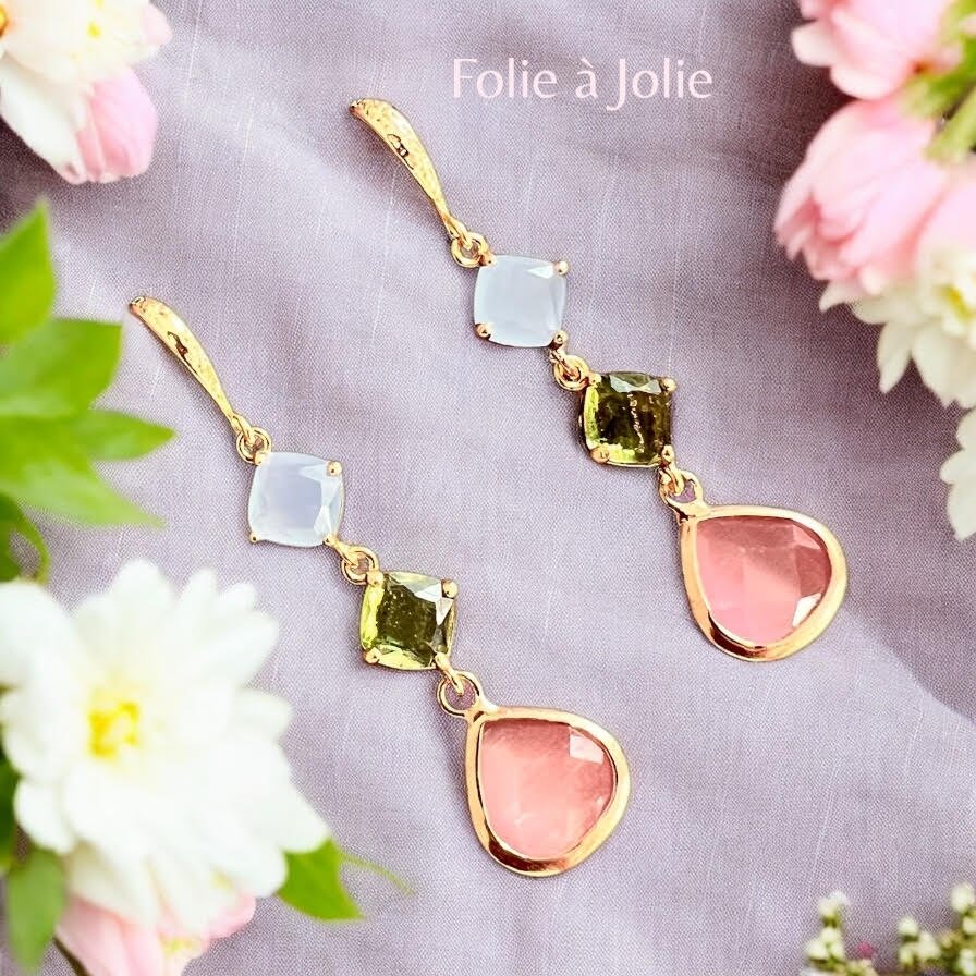 Delicate goldplated set in mooie voorjaarstinten. IJsblauw, grasgroen en snoepjesroze. Deze oorbellen dragen heerlijk licht aan het oor. De oorhaakjes zijn ook goldplated, irriteren niet en blijven mooi van kleur.