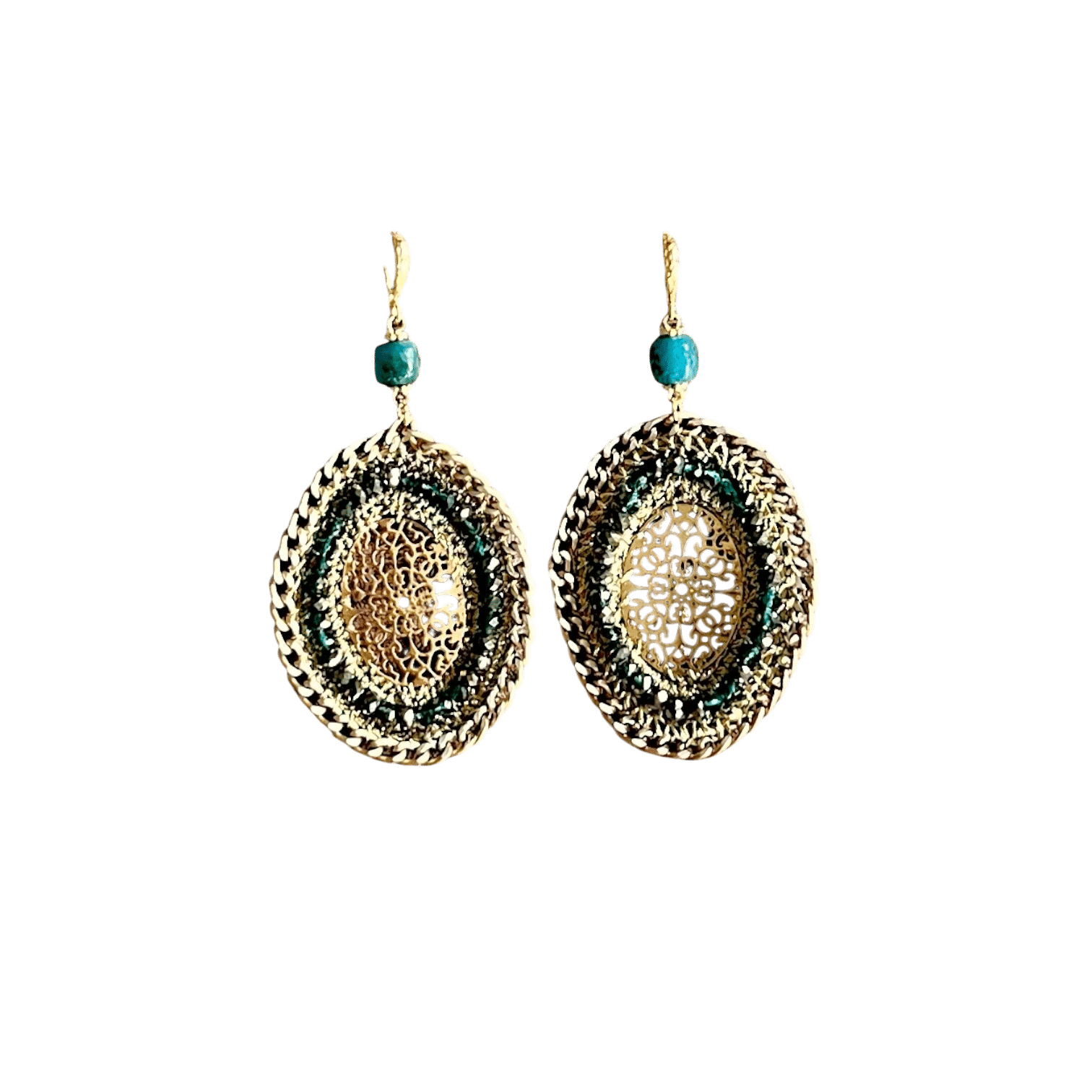 Wowzers, wat een te gekke nieuwe Statement Oorbellen! Goldplated oorhaakjes met goldplated petrol jade (de kleur kan per set licht afwijken, sommige steentjes zijn iets lichter of iets donkerder dan op de foto) en leuke hangers van filigree en petrol crystals.