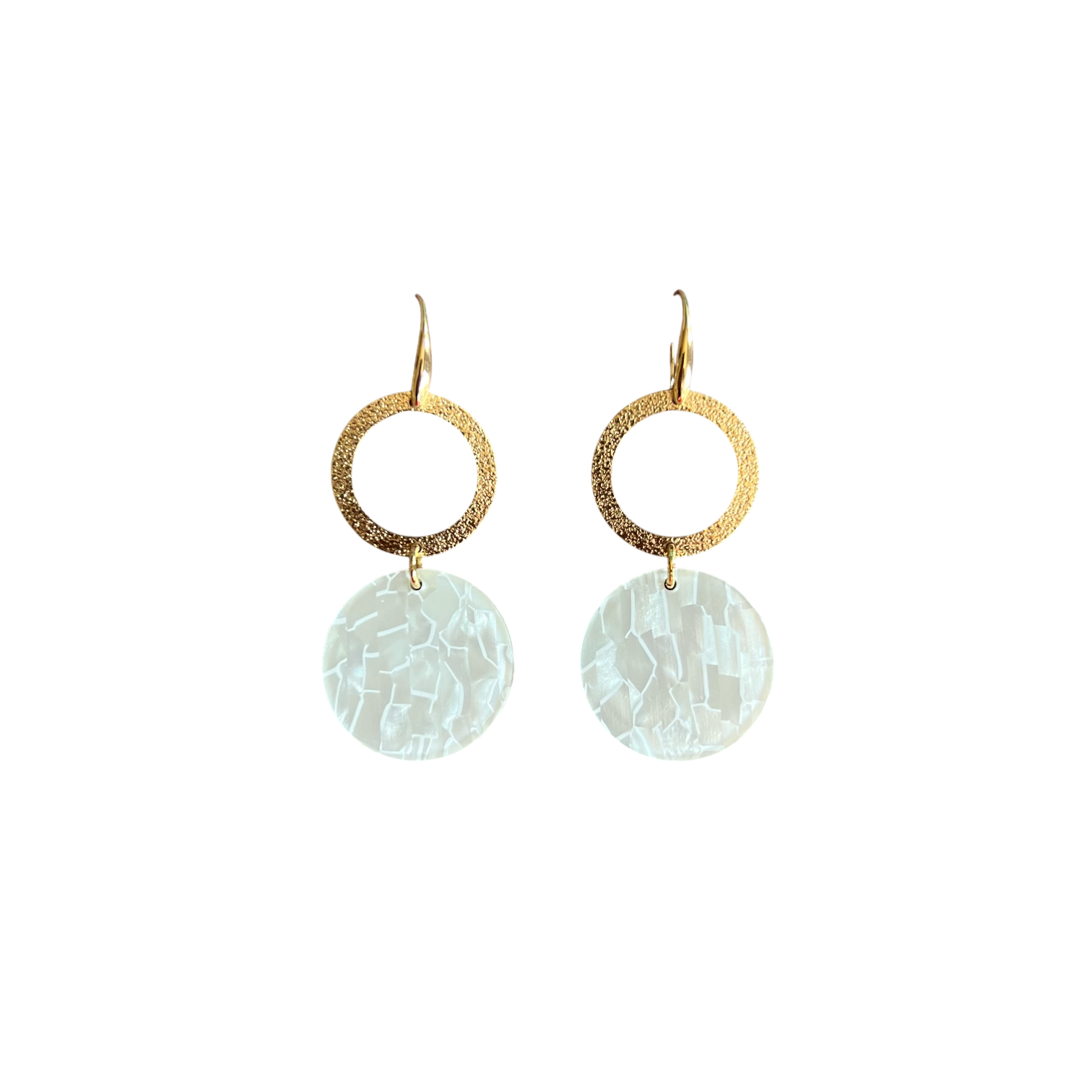 Goldplated oorhaakjes met goudkleurige brushed ringen en mooie roomwitte resin hangers met een gemêleerd printje. Ze dragen heerlijk licht aan het oor.