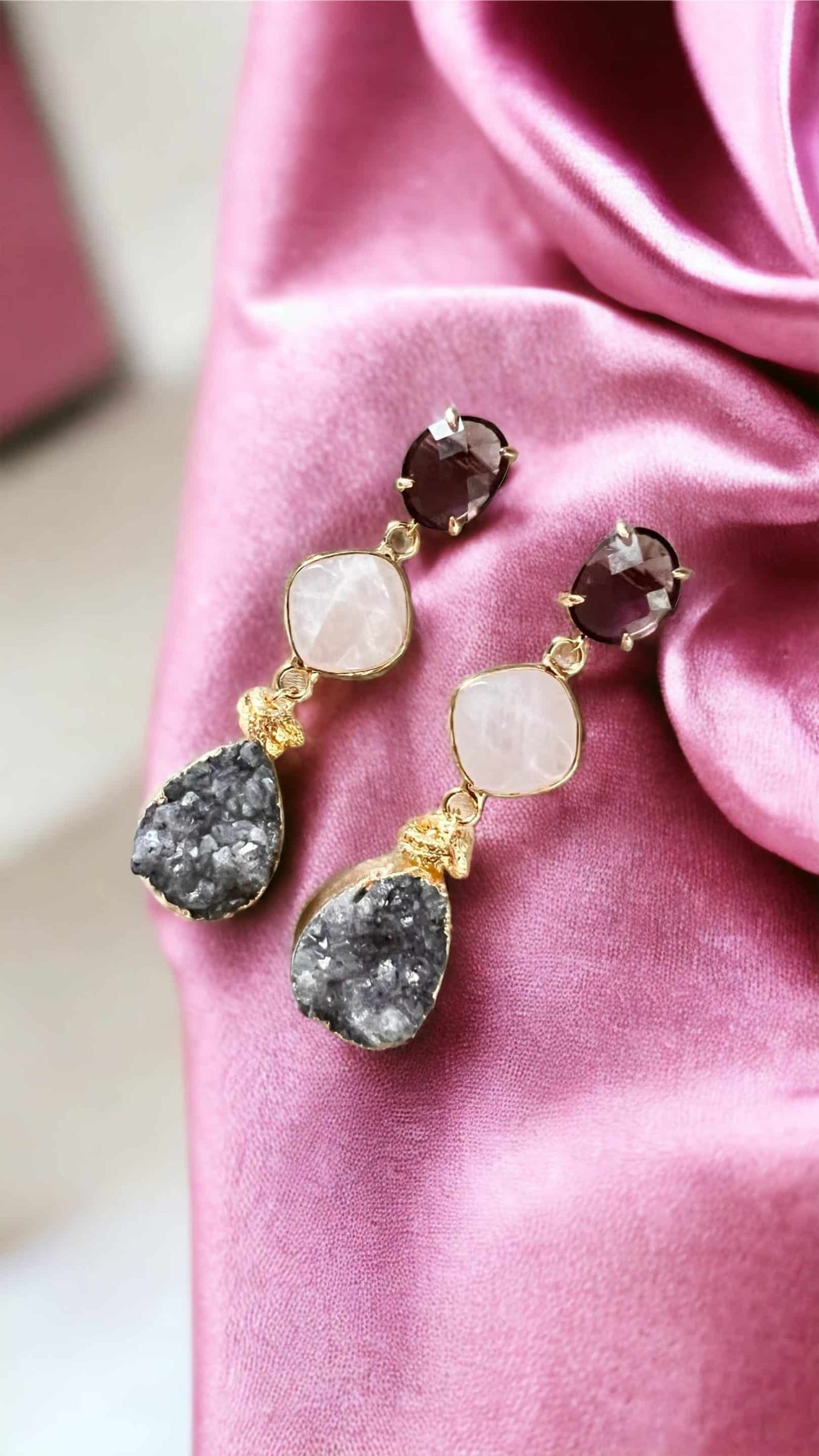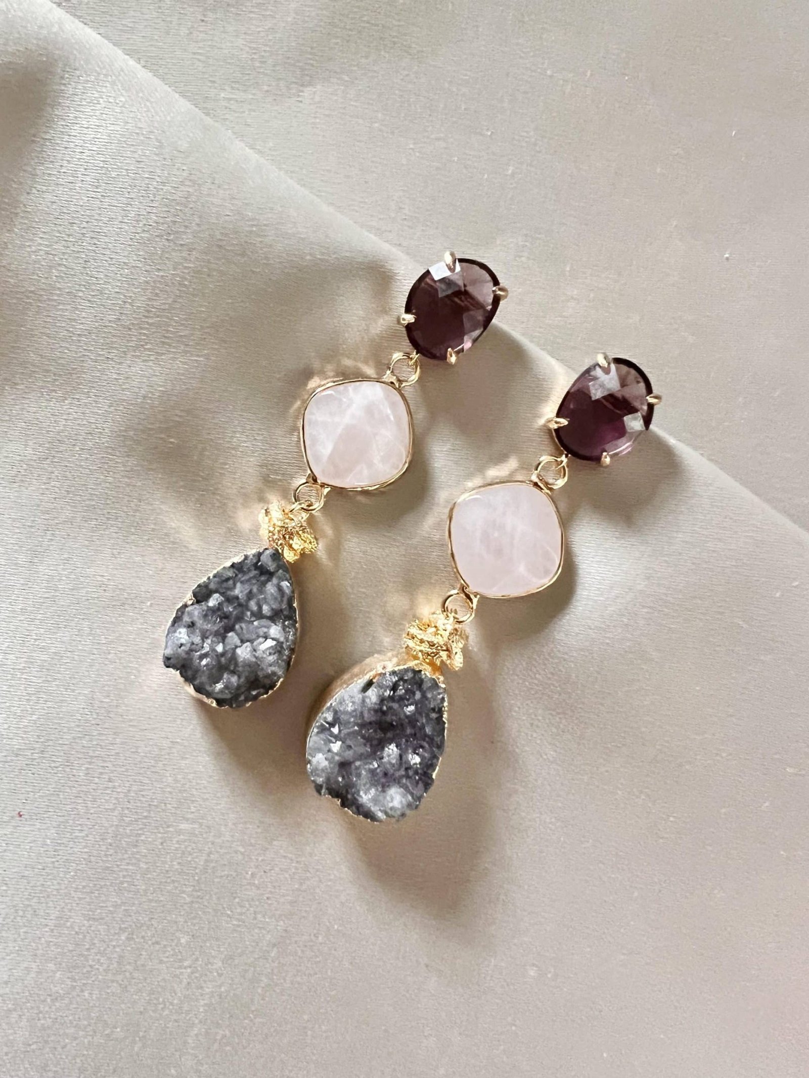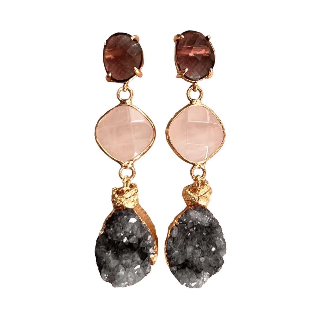 Burgundy oorstekers met rooskwarts en natuurlijke grijze druzy, afgewerkt met goldplated twisted muntjes.