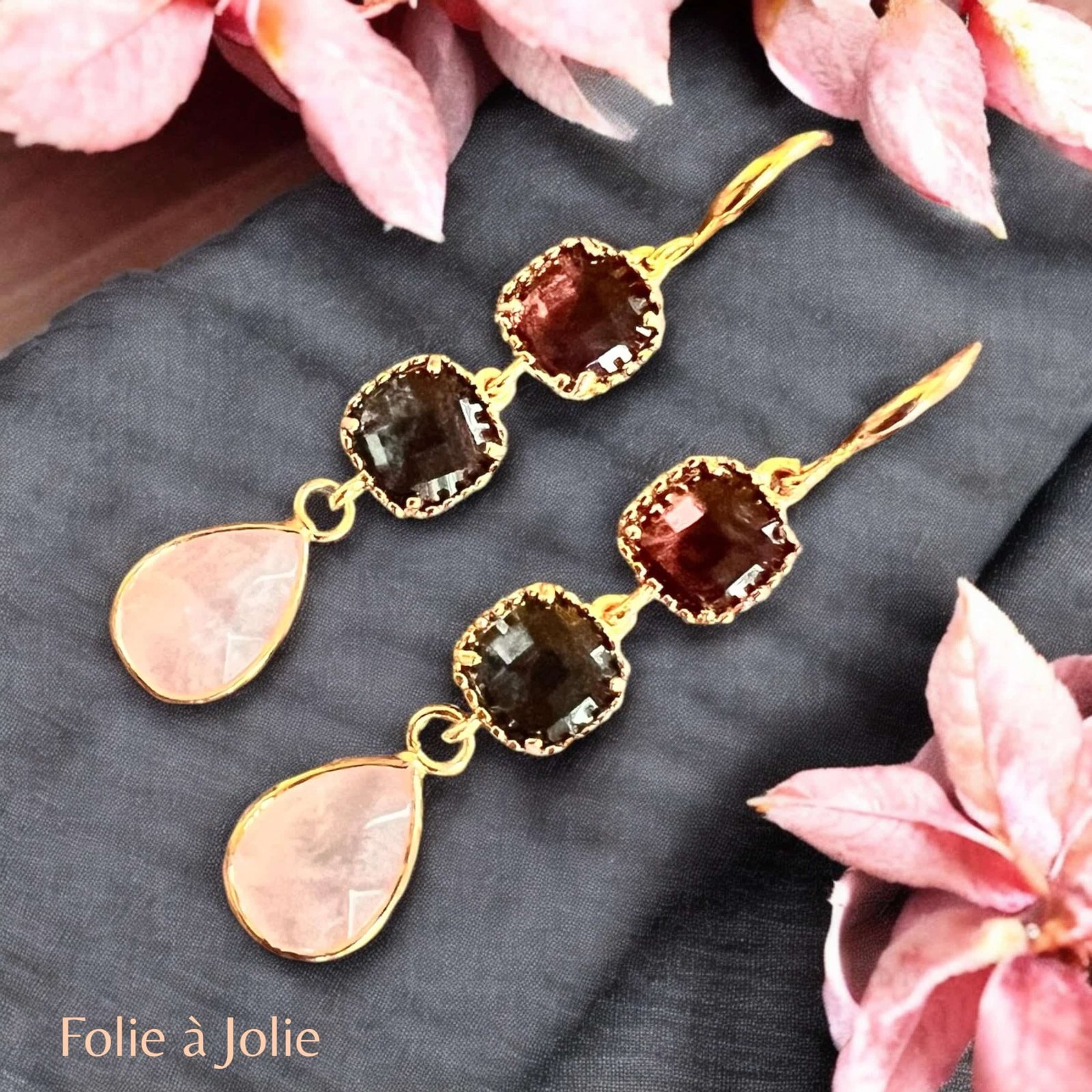 Wat een mooie kleurencombinatie! Goldplated rozenkwarts drops gecombineerd met goldplated glassteentjes in Burgundy en Grijs. De oorhaakjes zijn ook goldplated.
