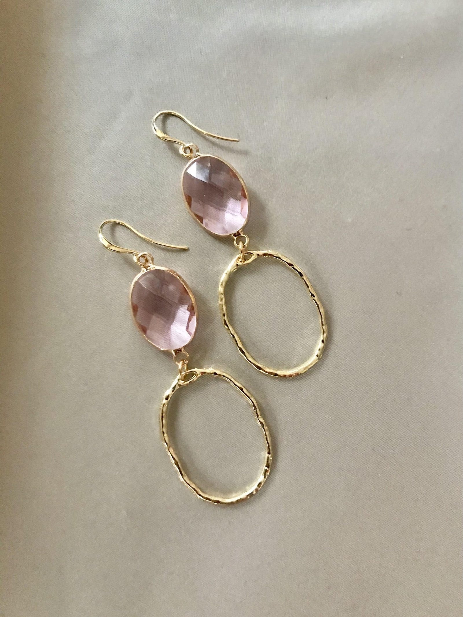 Vergulde oorhaakjes met roze glasstenen en onregelmatige goudkleurige ovale hangers die heerlijk licht dragen!