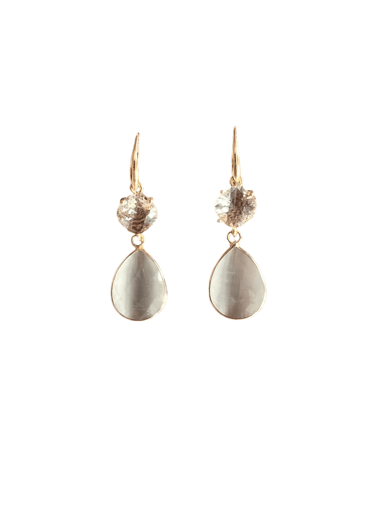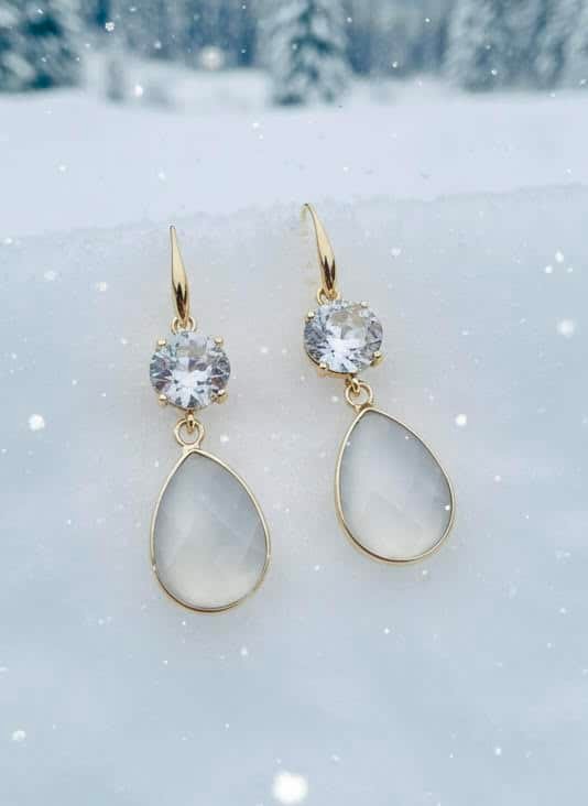 Deze vergulde oorbellen met oorhaakjes hebben een elegante en frisse uitstraling. Het clear white steentje zorgt voor een subtiele sparkle, terwijl de witte catseye drops een zachte, luxe touch toevoegen.