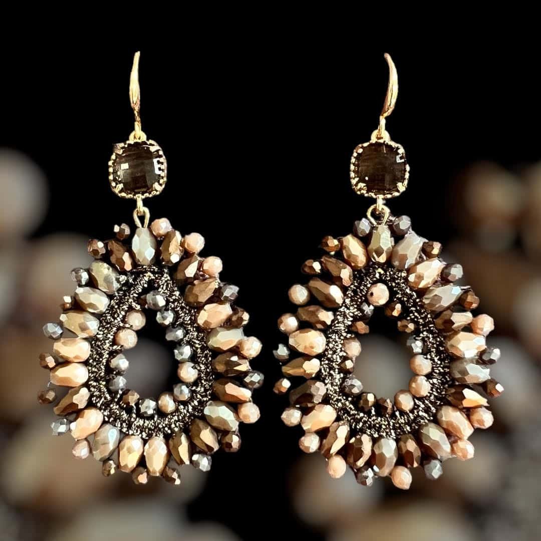 Bruine crystals van Folie à Jolie met goldplated bruine glassteentjes en goldplated oorhaakjes.