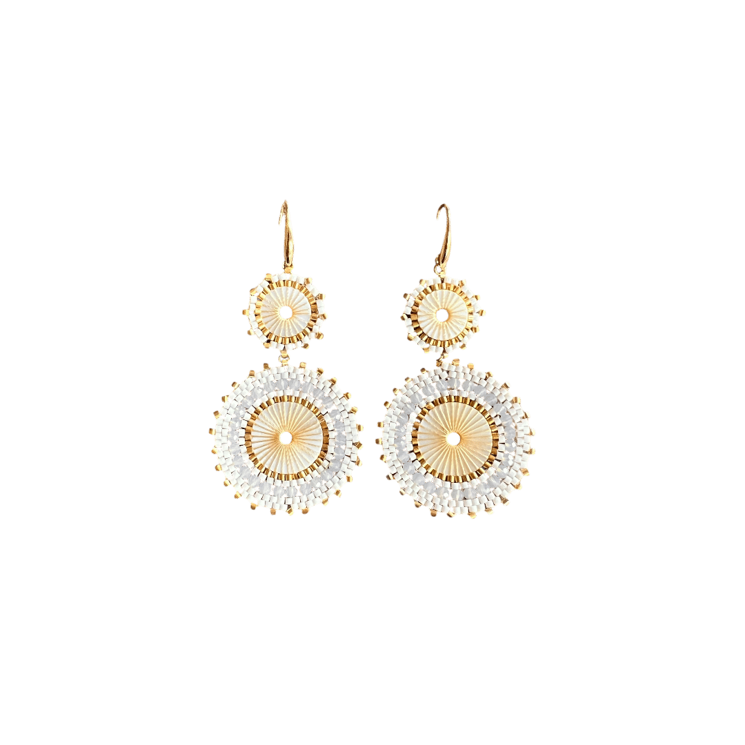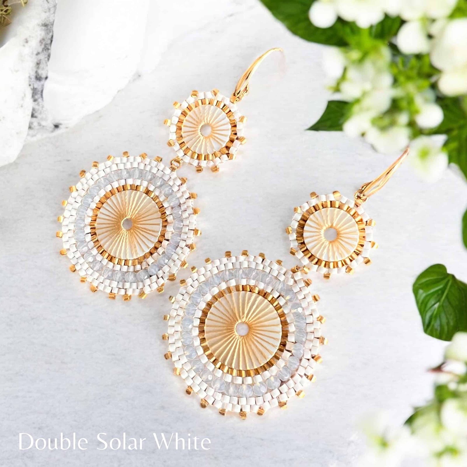 Vergulde oorhaakjes met Double Solar hangers in de kleur wit. En ohhh wat draagt deze set heerlijk licht!