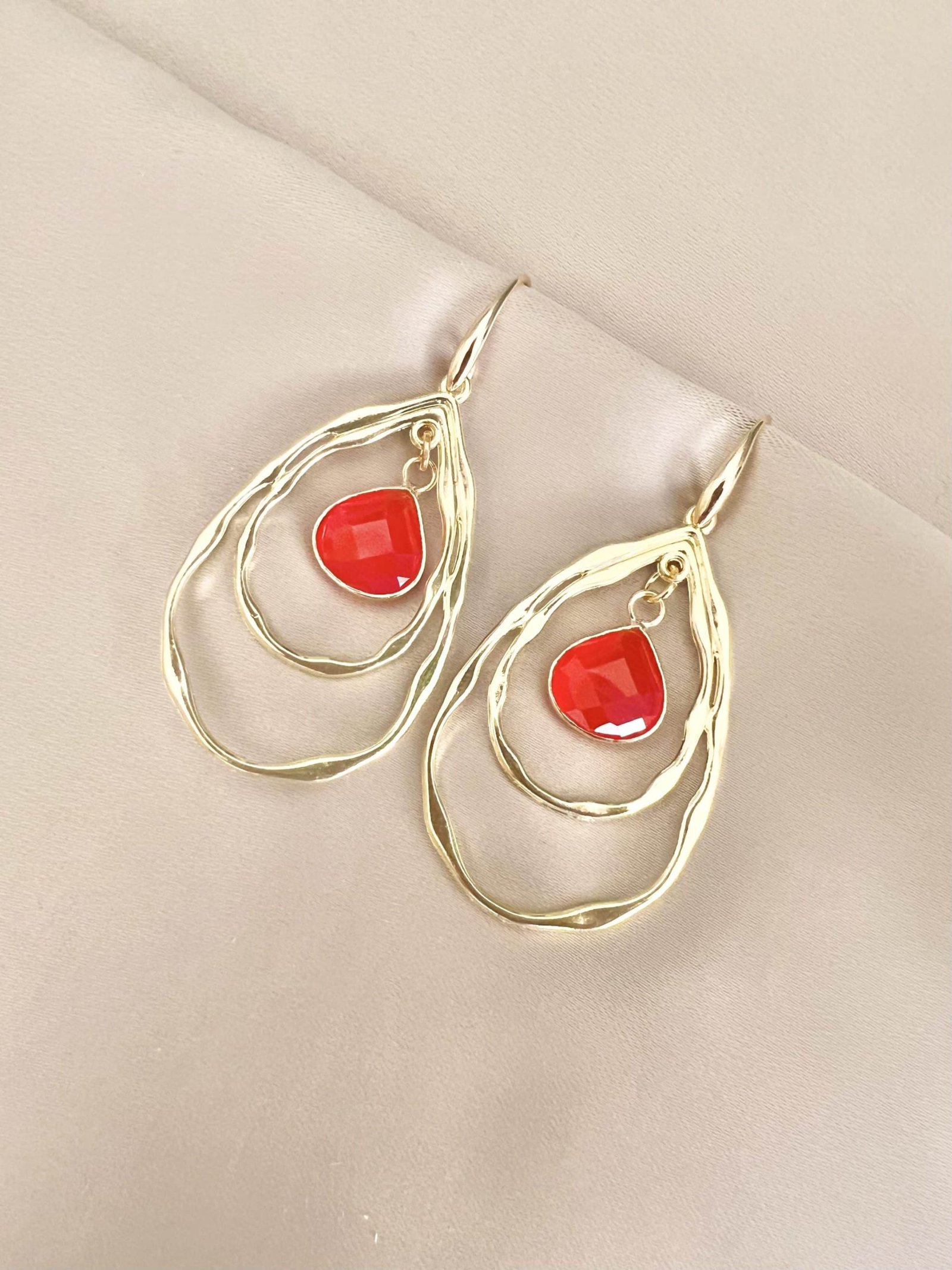 Goldplated oorhaakjes met leuke chunky dubbele open drops met warmoranje steentjes.