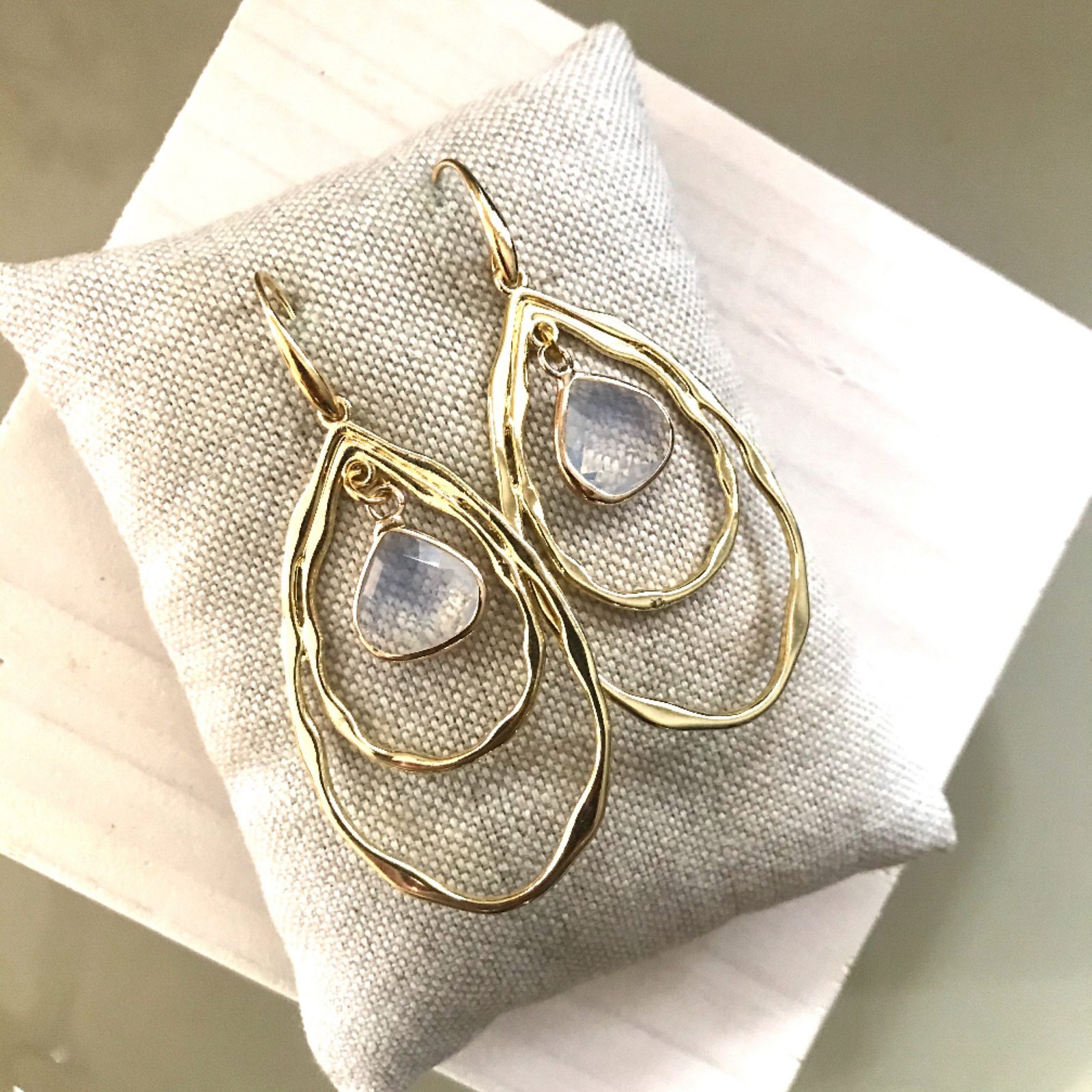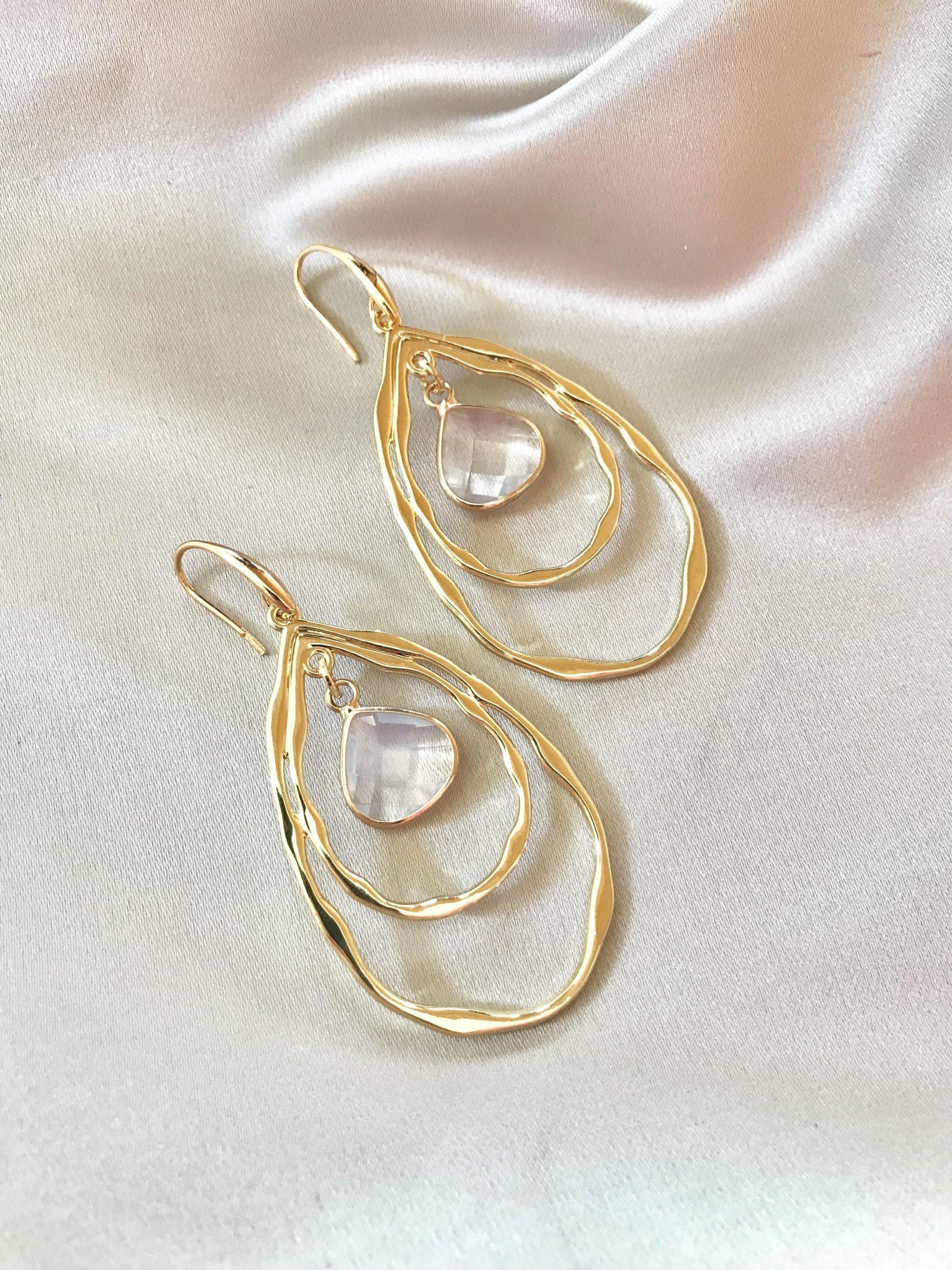 Goldplated oorhaakjes met dubbele goudkleurige open hangers drops met clear glazen drops. Goed te combineren!