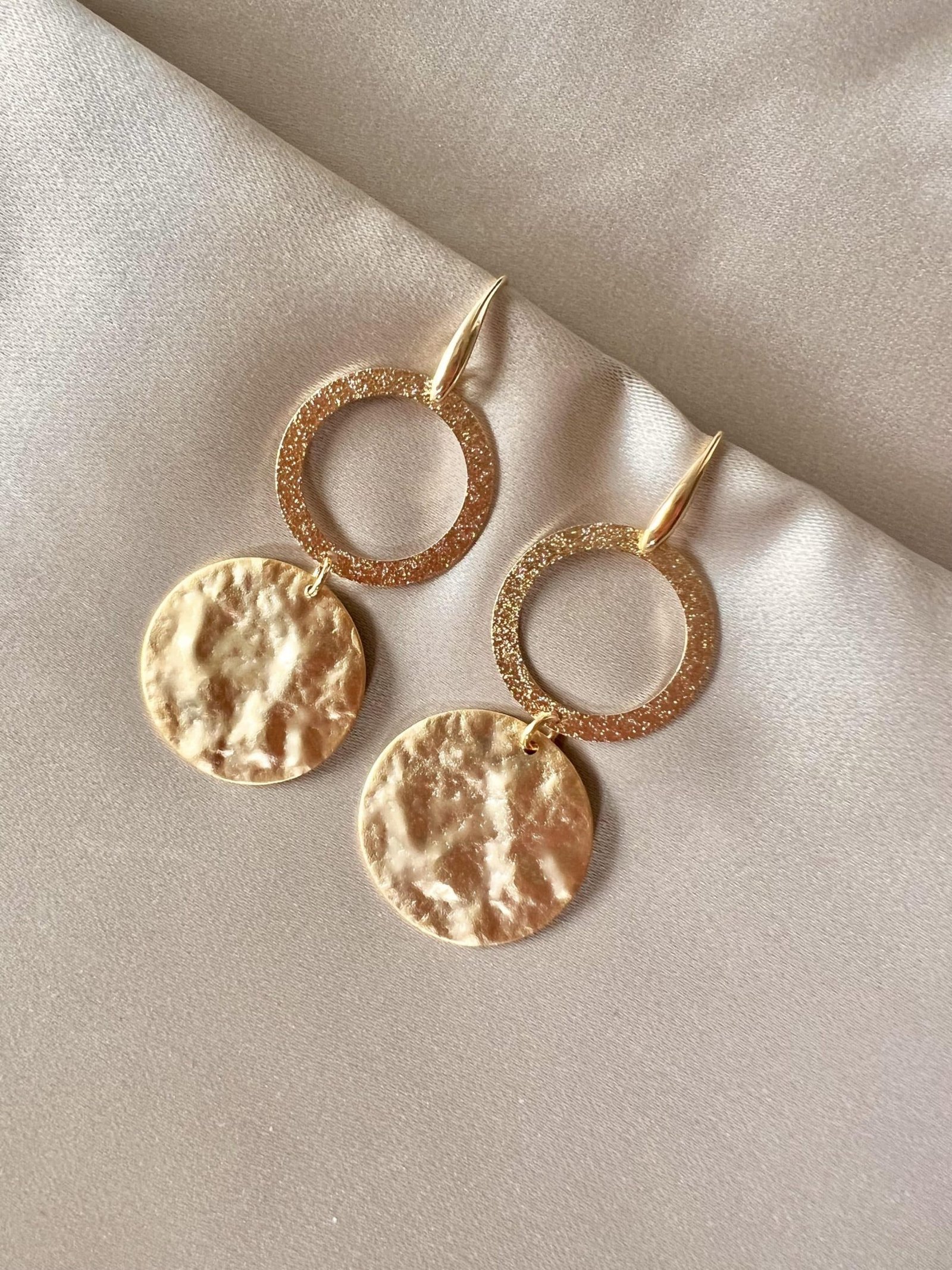 Goldplated oorhaakjes en goudkleurige  rondellen gecombineerd met gehamerde goldplated open drops.
