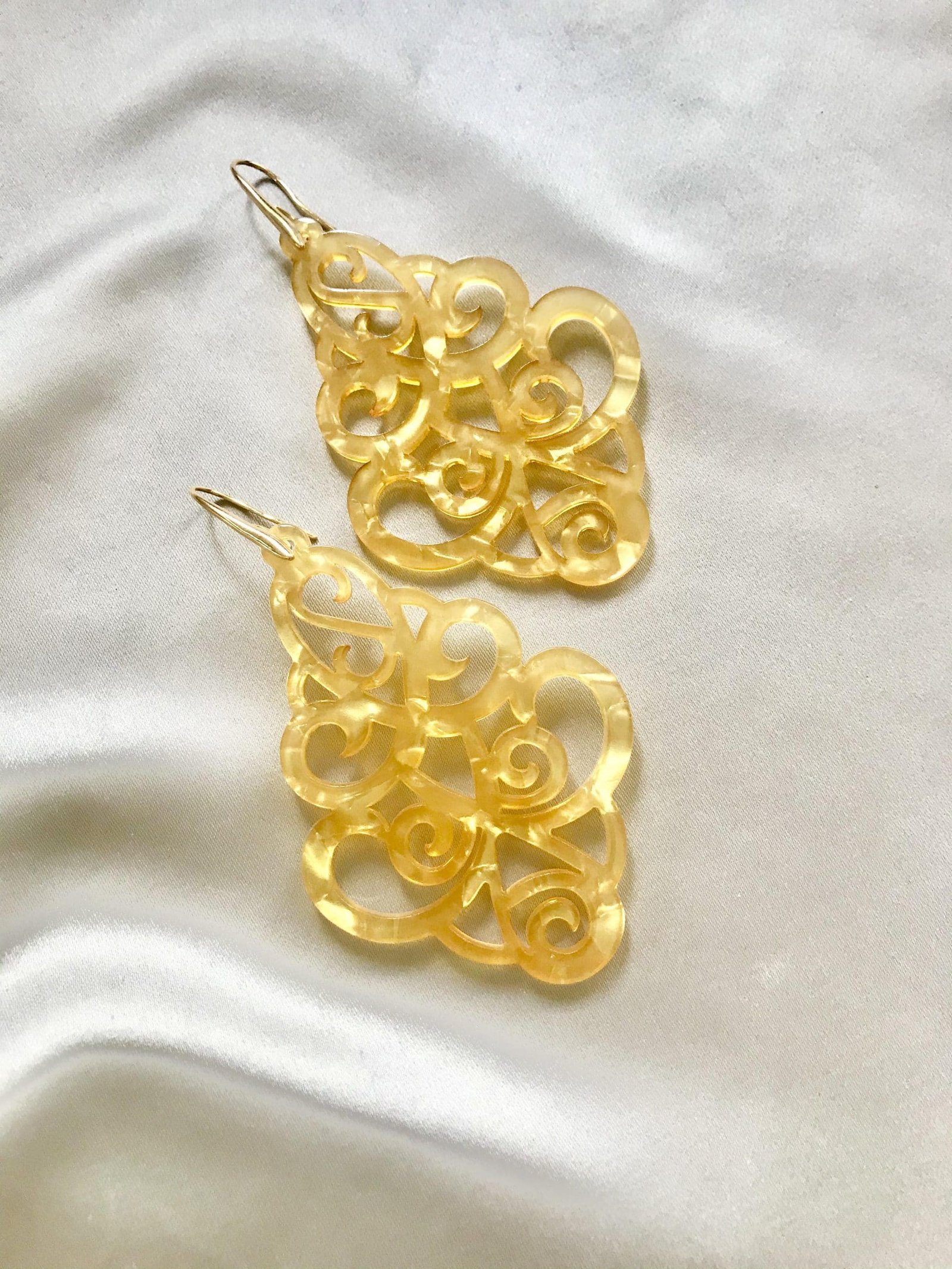 Vergulde oorhaken met leuke opengewerkte gele resin hangers (‘kroonluchters’). Leuke statement oorbellen die toch licht dragen.