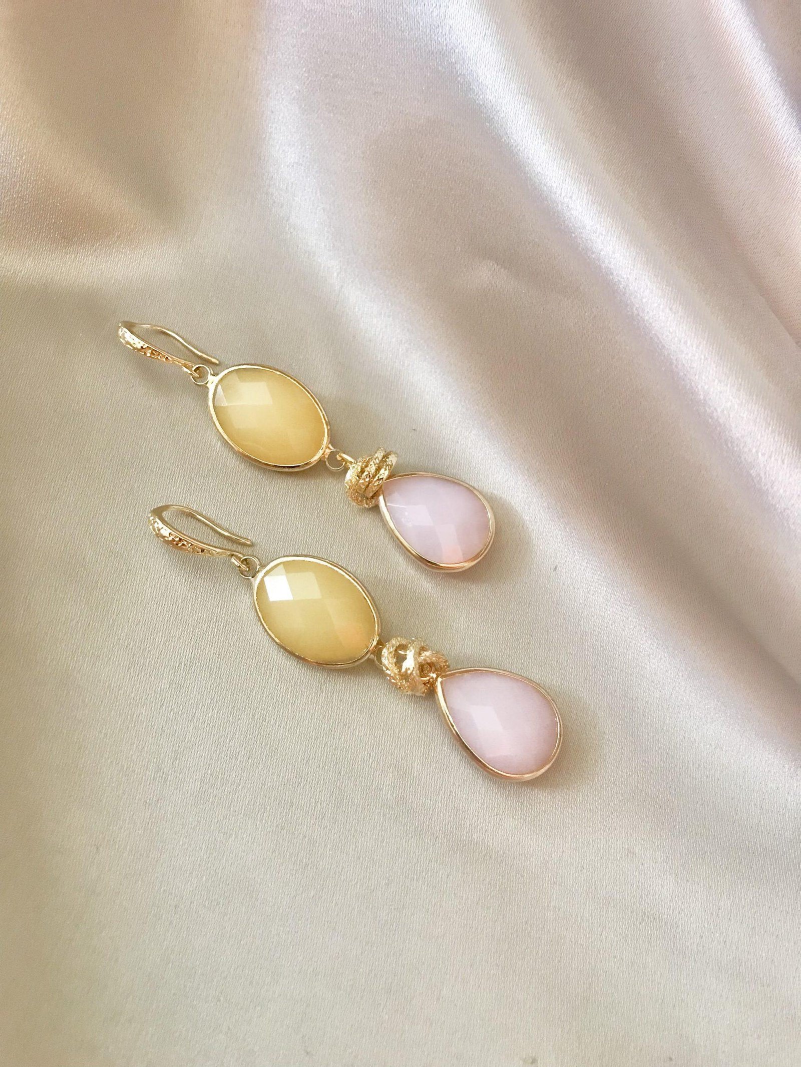 Meer vrolijke oorbellen van Folie à Jolie! Mooie kwaliteit vergulde oorhaakjes met gele en roze jade stenen, afgewerkt met vergulde twisted ringetjes.