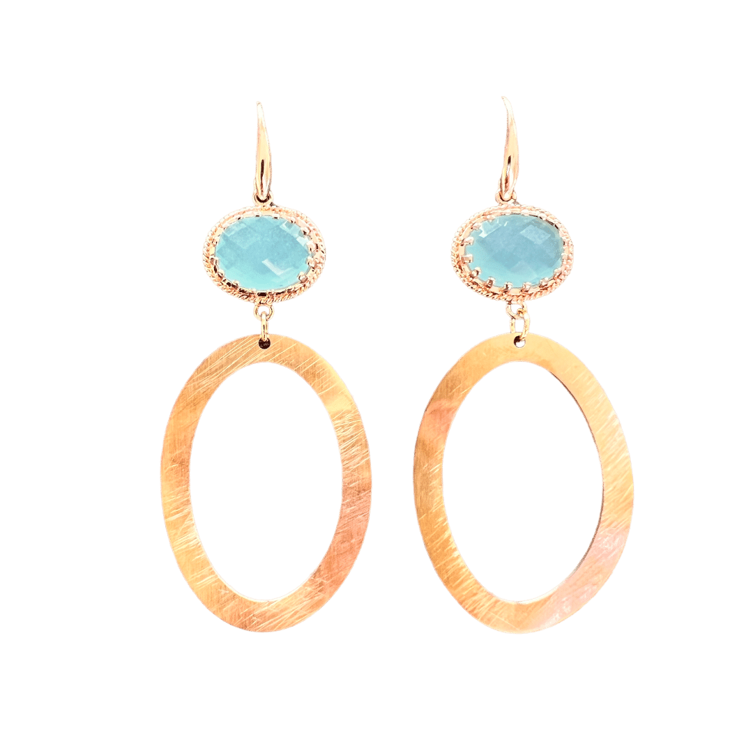 Vergulde oorhaakjes met goldplated facetgeslepen glasstenen in de kleur Aqua met gouden ovalen. Ze dragen licht aan het oor.