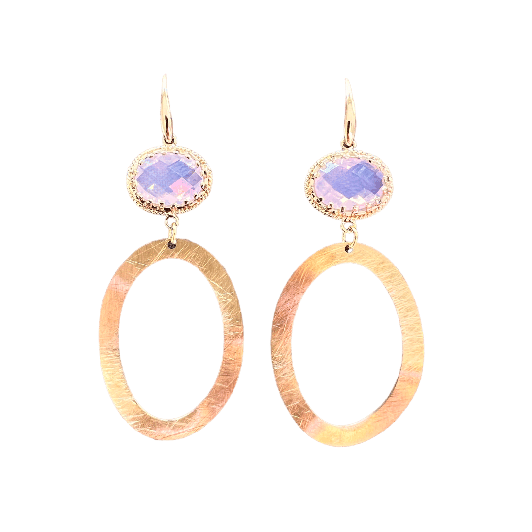 Vergulde oorhaakjes met goldplated facetgeslepen glasstenen in het Blush Pink met gouden ovalen. Ze dragen licht aan het oor.