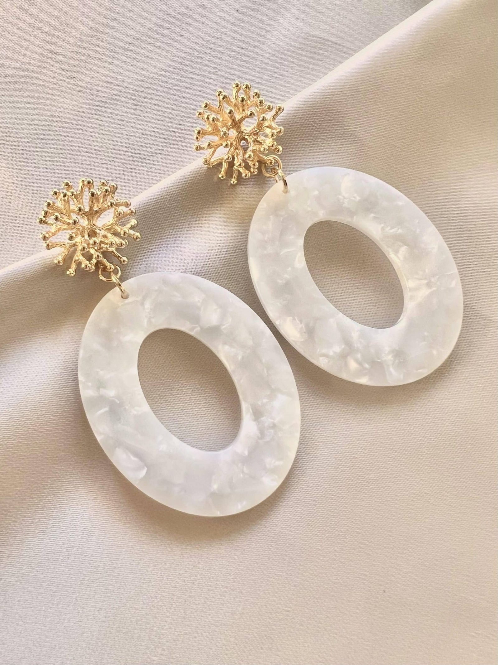 Goldplated coral oorstekers gecombineerd met witte resin hangers. De oorstekers staan heel leuk aan het oor en de hangers dragen heerlijk licht!