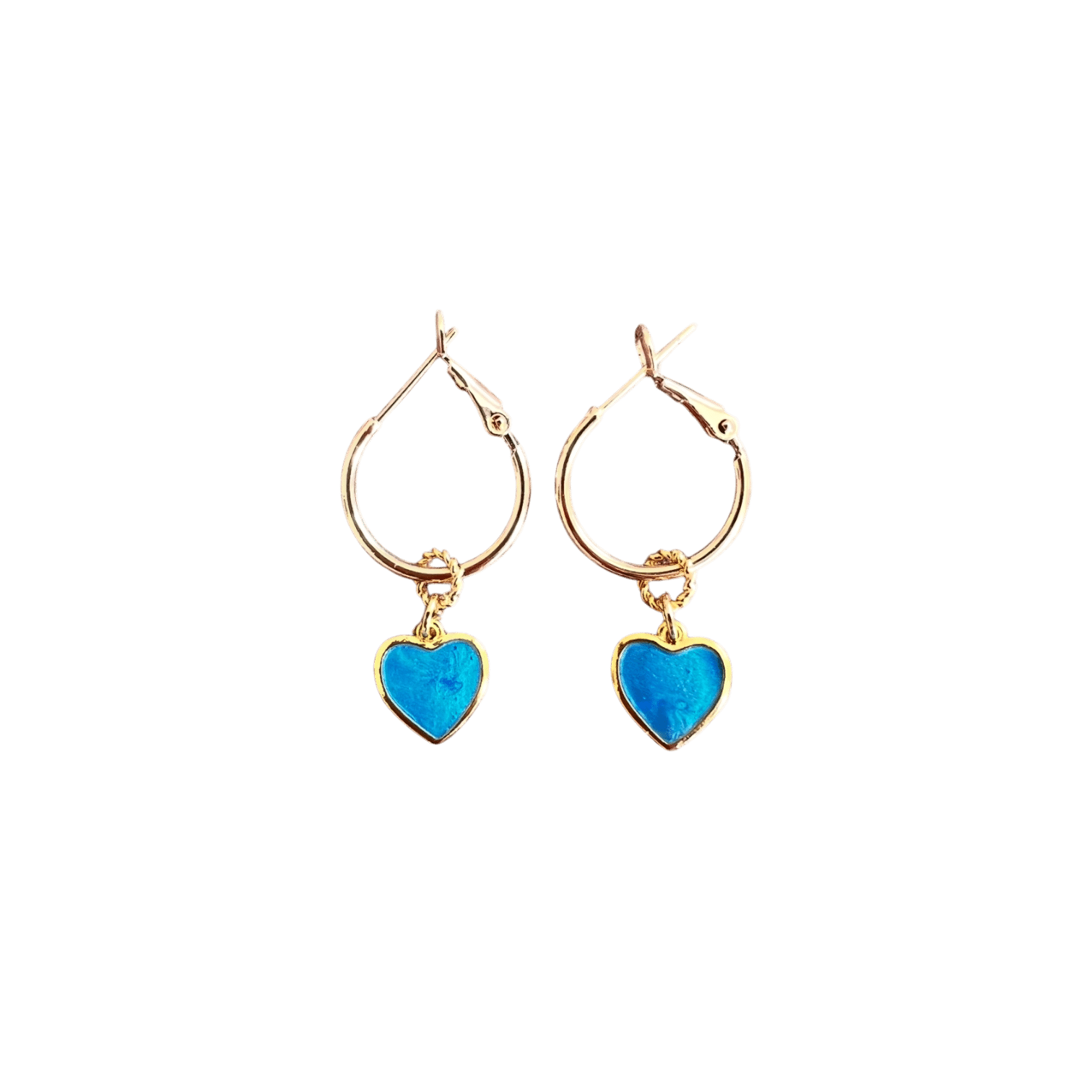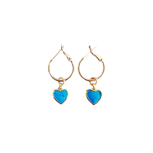 Wat een cuties! Goldplated oorringen (doorsnede 1,5 cm) met goldplated hartjes in een waanzinnige kleur blauw.