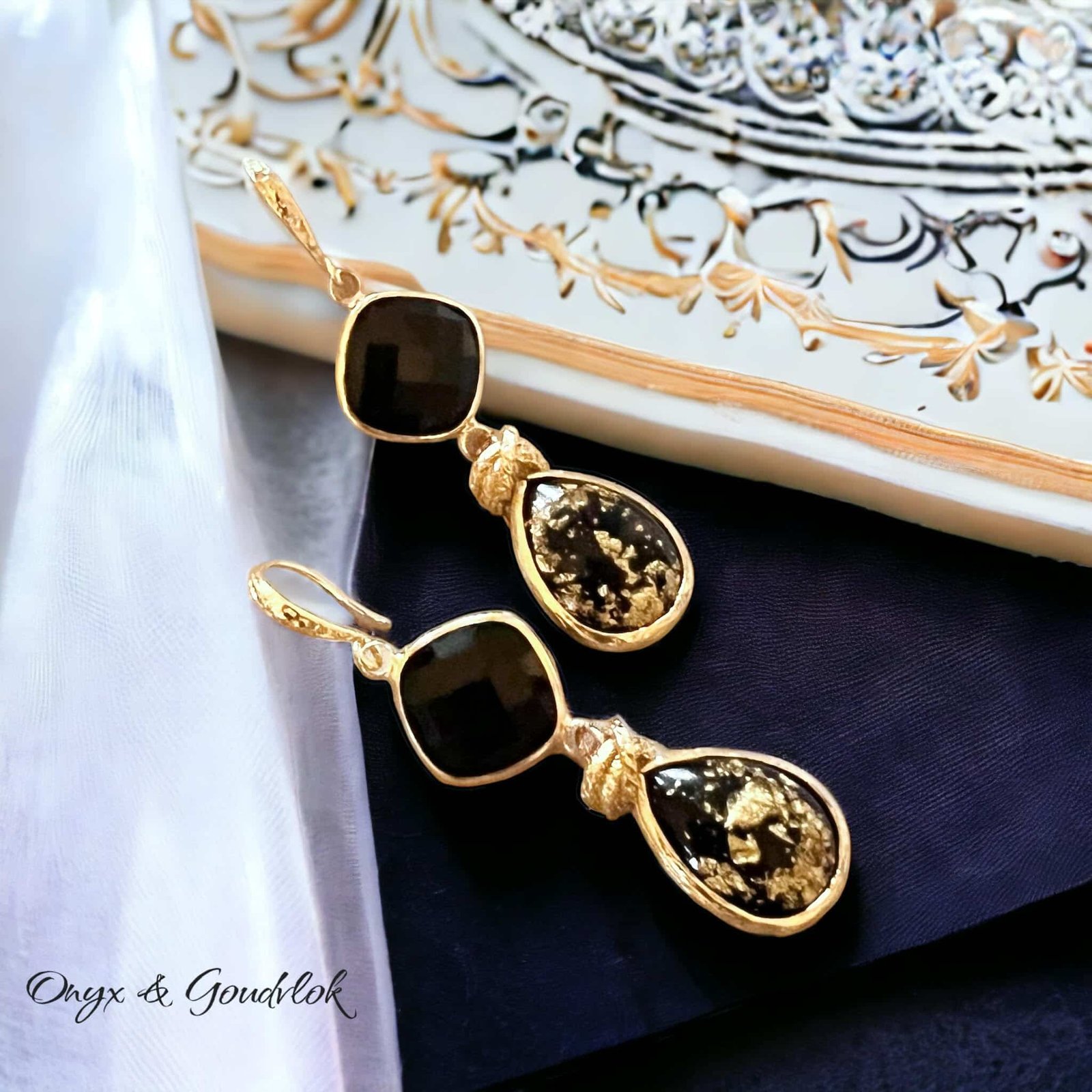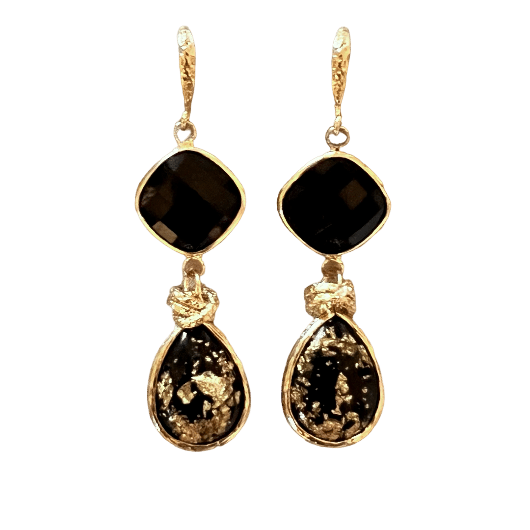 Leave a sparkle where ever you go met deze leuk set van goldplated oorhaakjes, goldplated onyx steen gecombineerd met leuke zwarte drops met goudvlokjes. Afgewerkt met goldplated ringetjes. Deze set draagt heerlijk licht aan het oor.