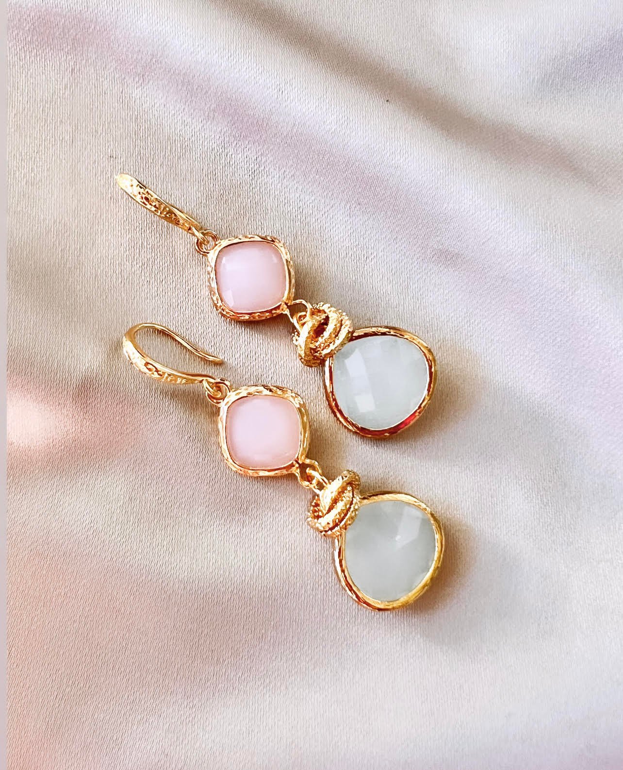 Mooie goldplated oorbellen van Folie à Jolie van medium formaat in prachtige pasteltinten. Roze en grijsblauwe jade. Ze dragen heerlijk licht aan het oor.
