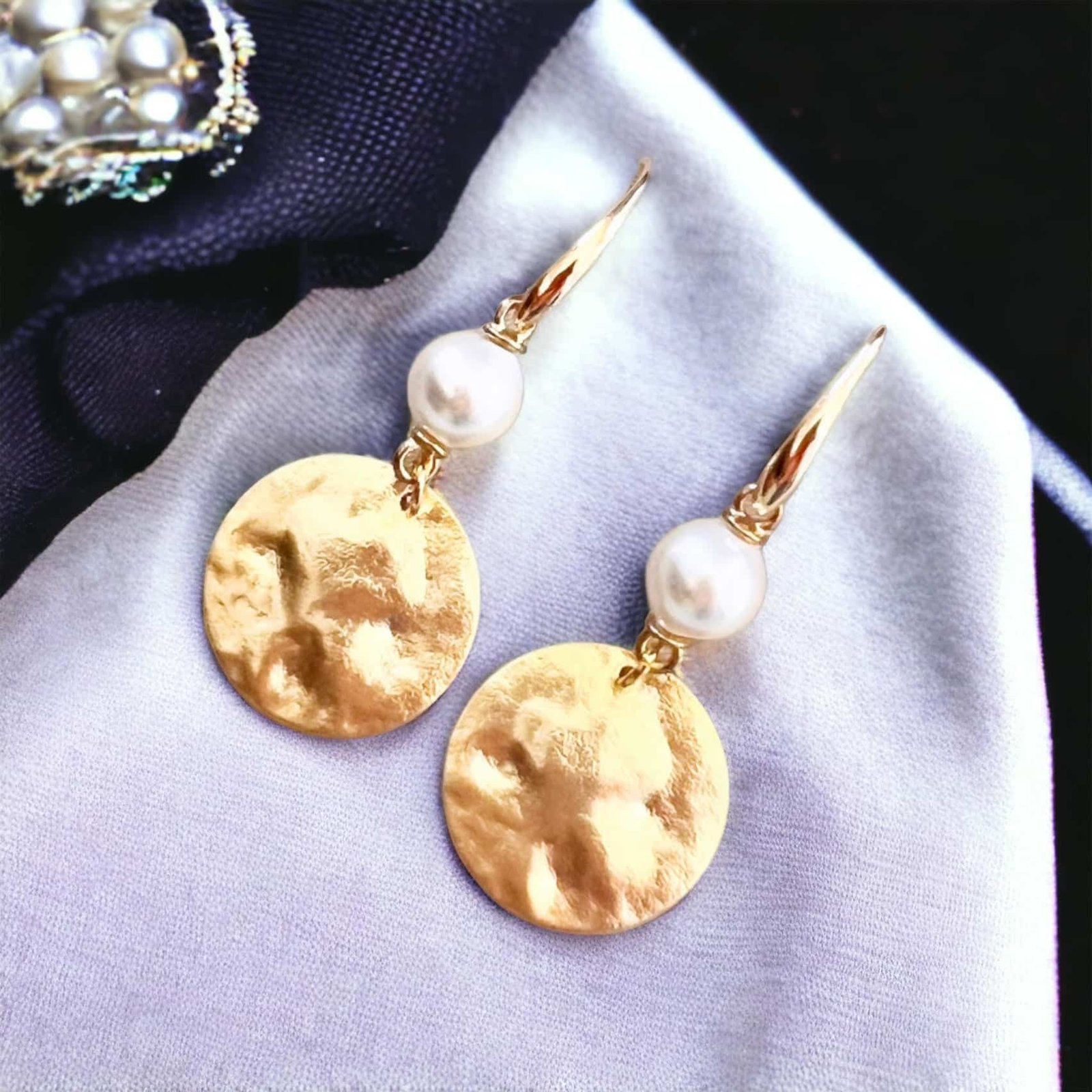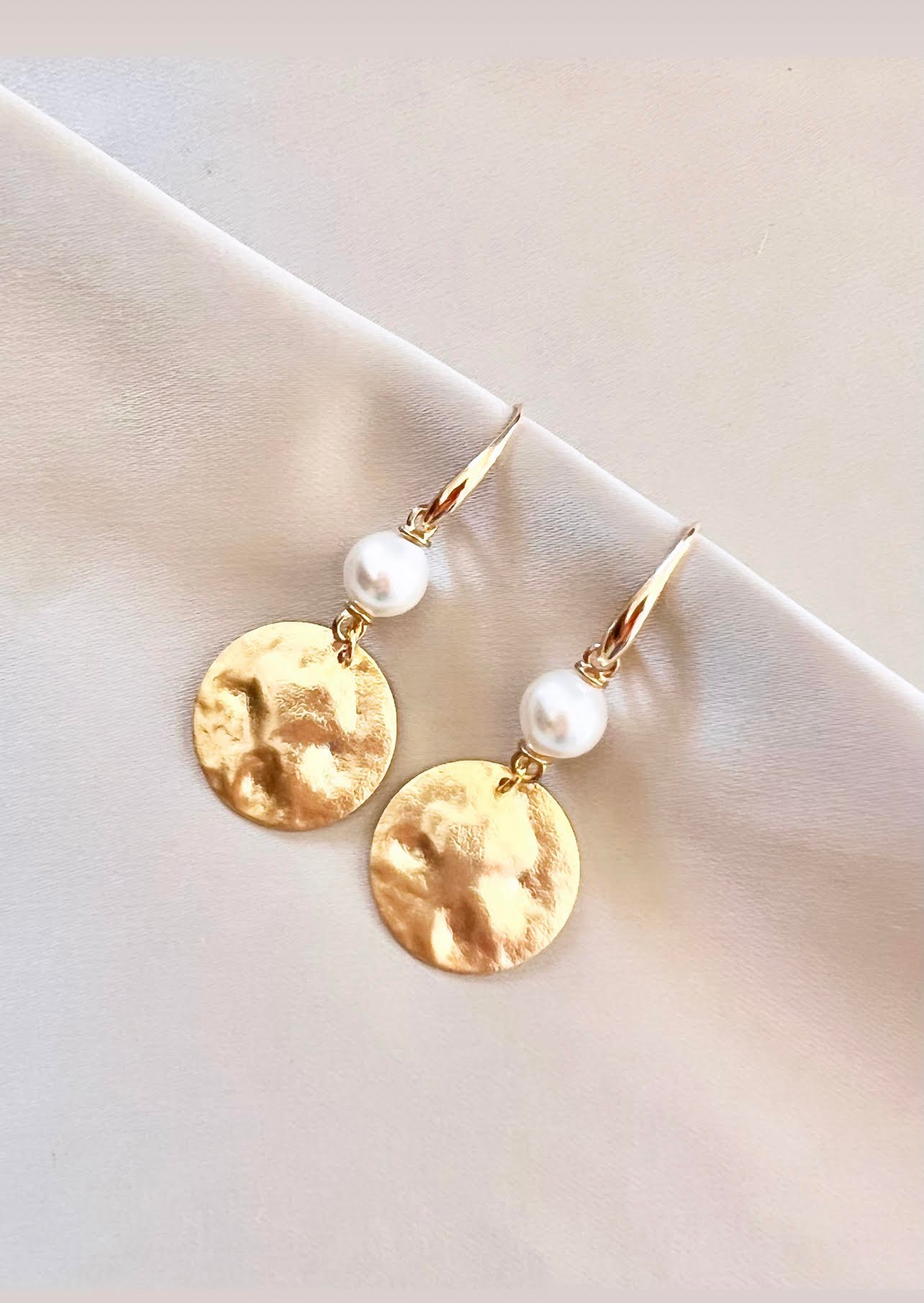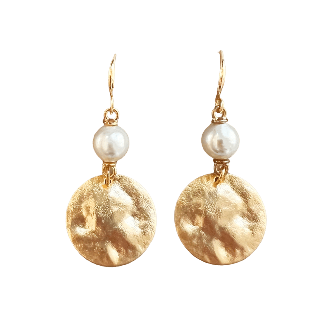 Zijn het geen dotjes? Vergulde oorhaakjes met vergulde pareltjes en vergulde gehamerde hangers. ook deze set draagt weer heerlijk licht!