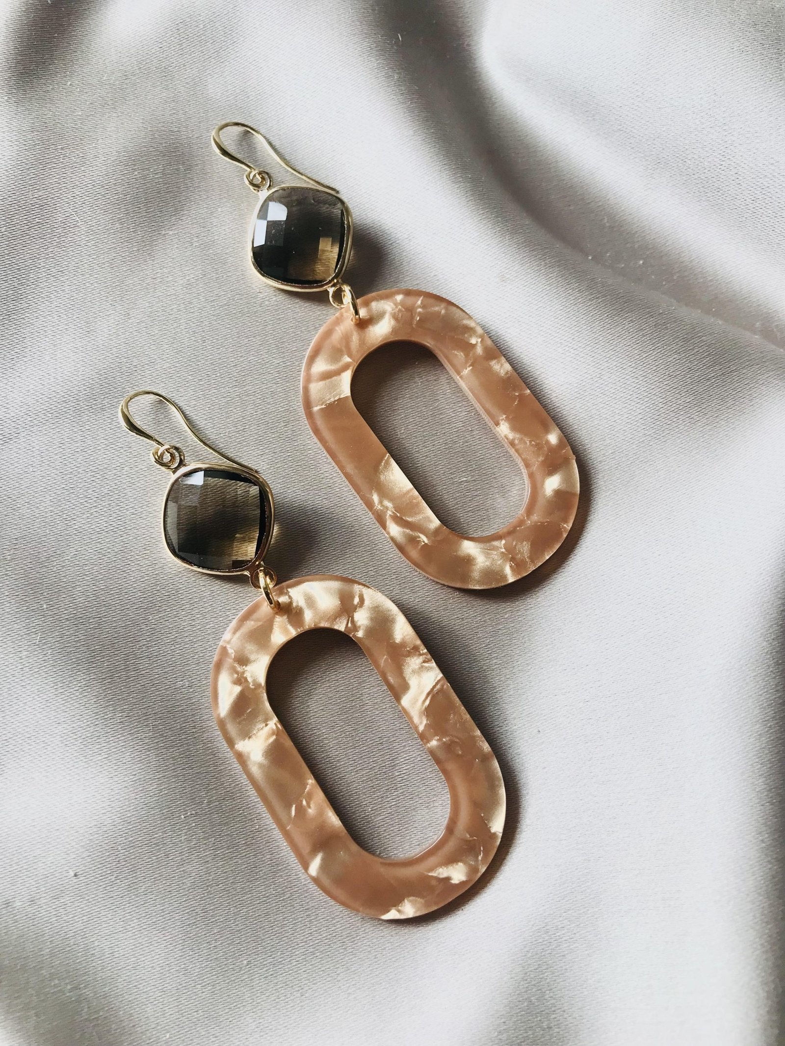 Vergulde oorhaakjes met bruine glasstenen en goudbeige resin hangers met een gemêleerde print. Ze dragen licht aan het oor.