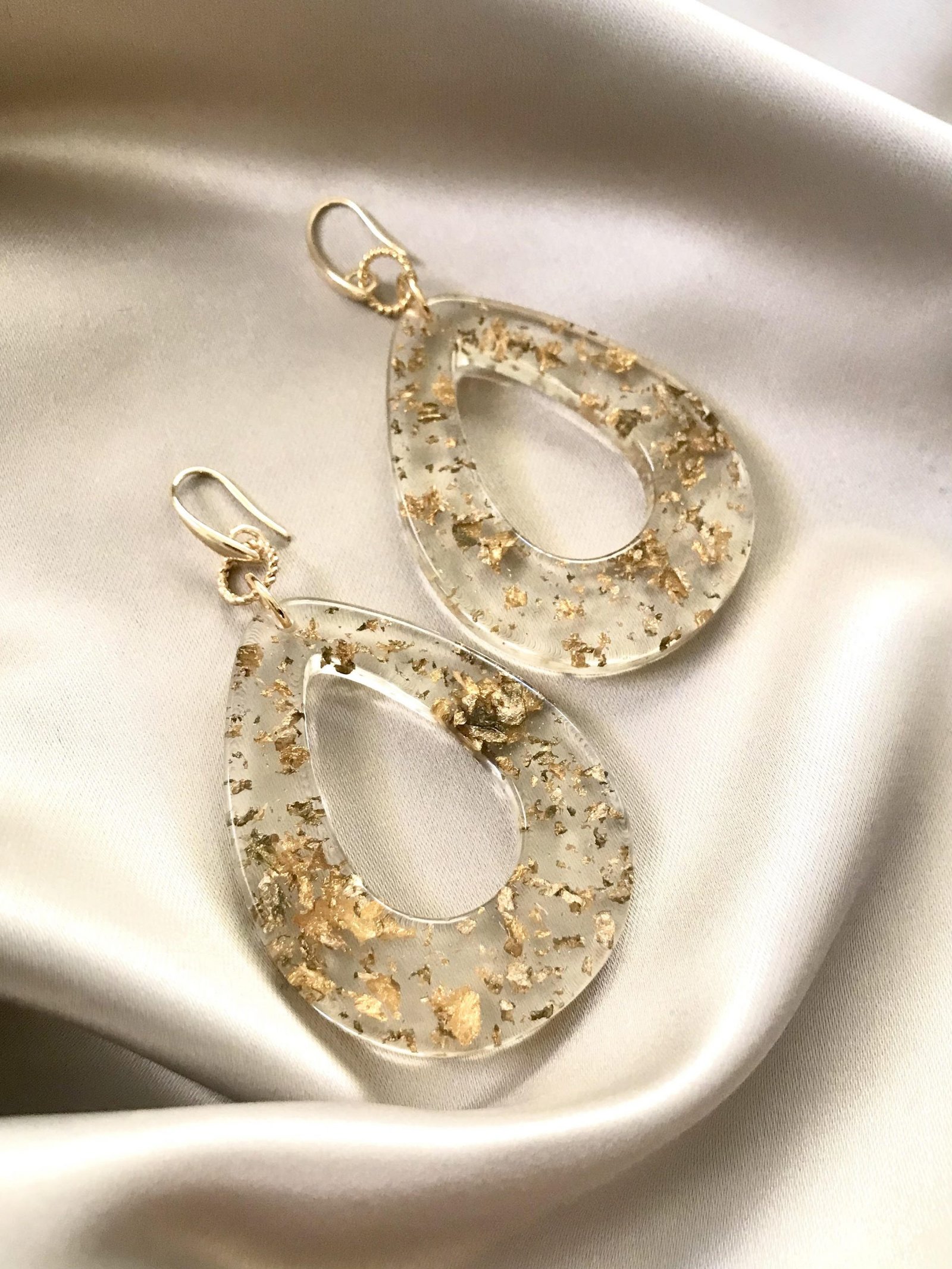 Goldplated oorhaakjes met twisted goudplated ringetjes en leuke transparante hangers met een goudvlok print.