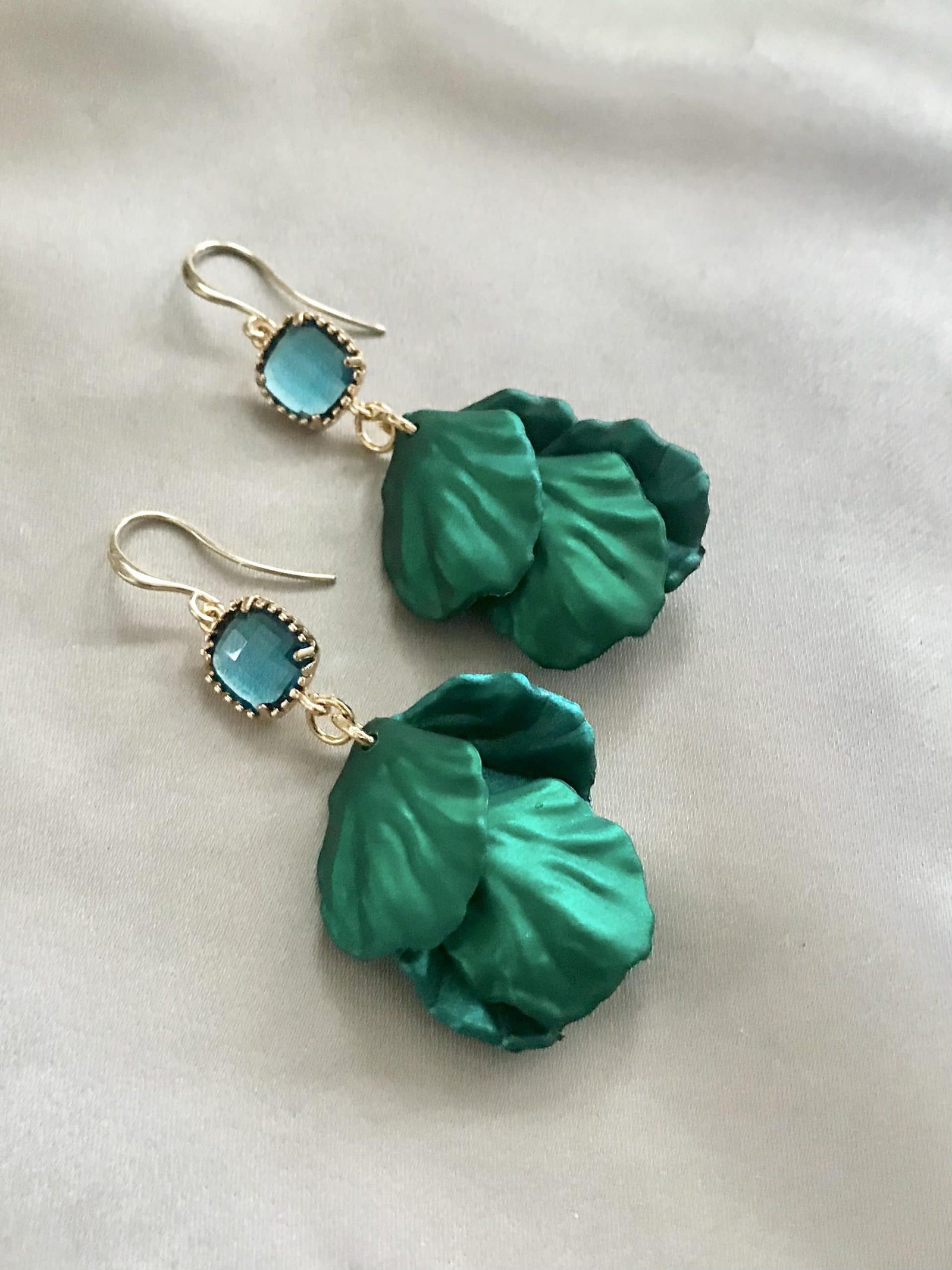 Vergulde oorhaakjes met petrolgroene glassteentjes gecombineerd met prachtige matte groene blaadjes die heel mooi het licht opvangen! Ze dragen heerlijk licht.