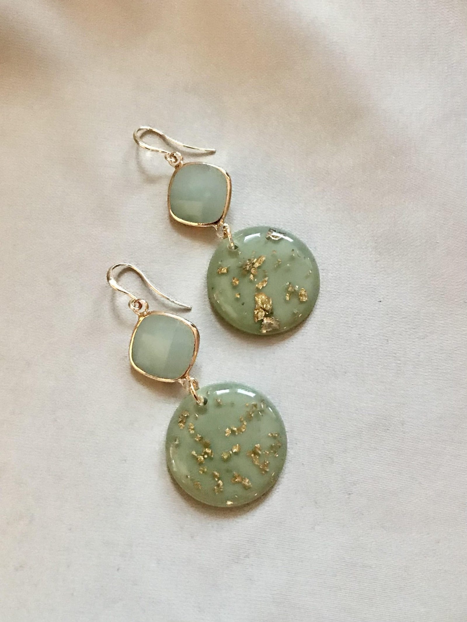 Mooie resin oorbellen met subtiele goudvlokjes in de prachtige kleur lindegroen, gecombineerd met jade in een passende mintkleur. Ze dragen heerlijk licht!