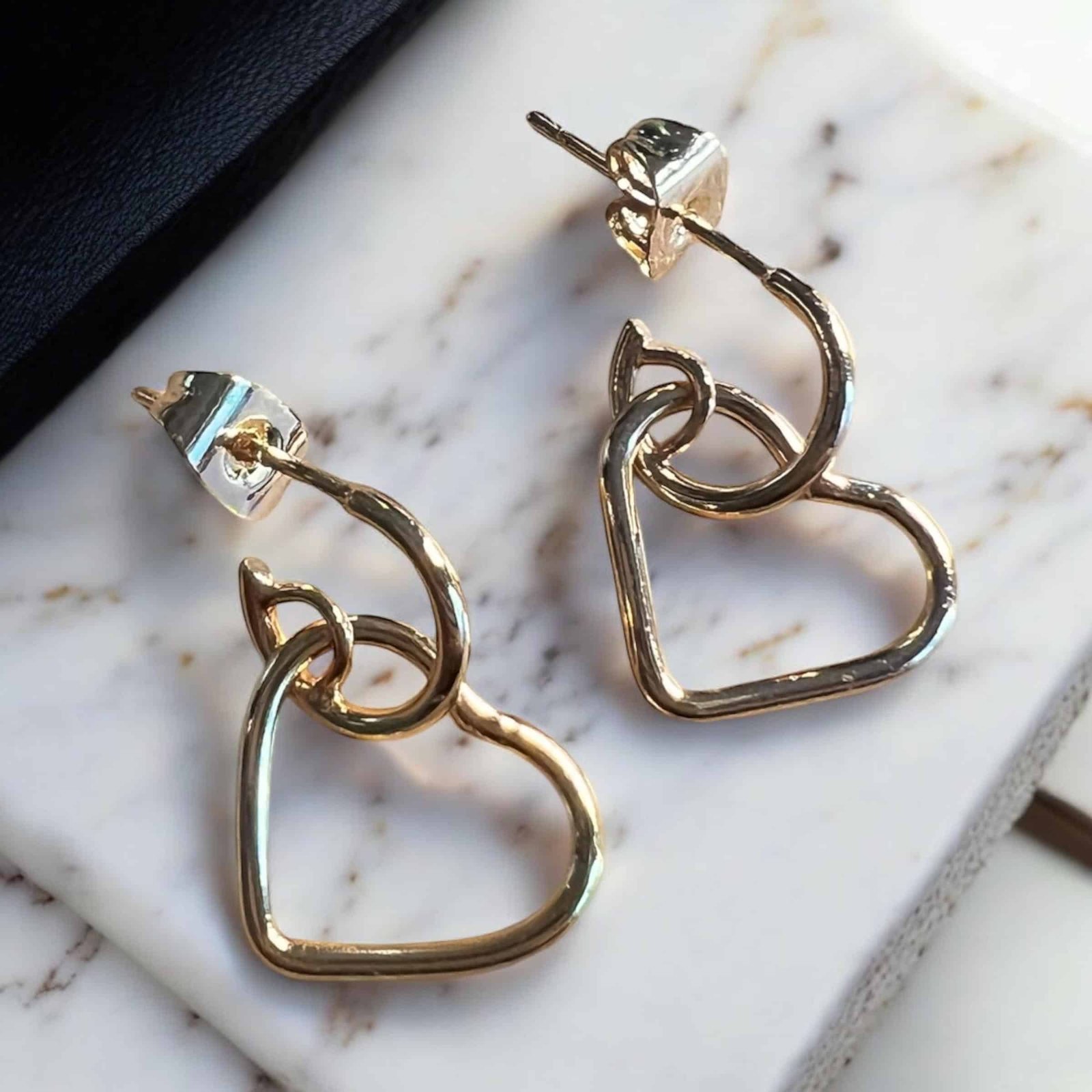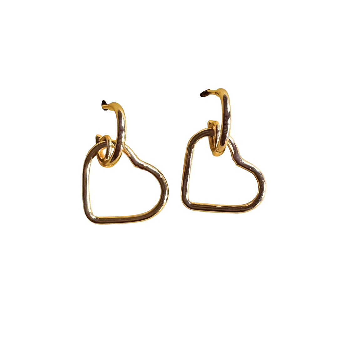 Wat een dotjes! Goldplated kleine oorringetjes (met steker) met goldplated open hartjes die je speels op hun kant draagt.