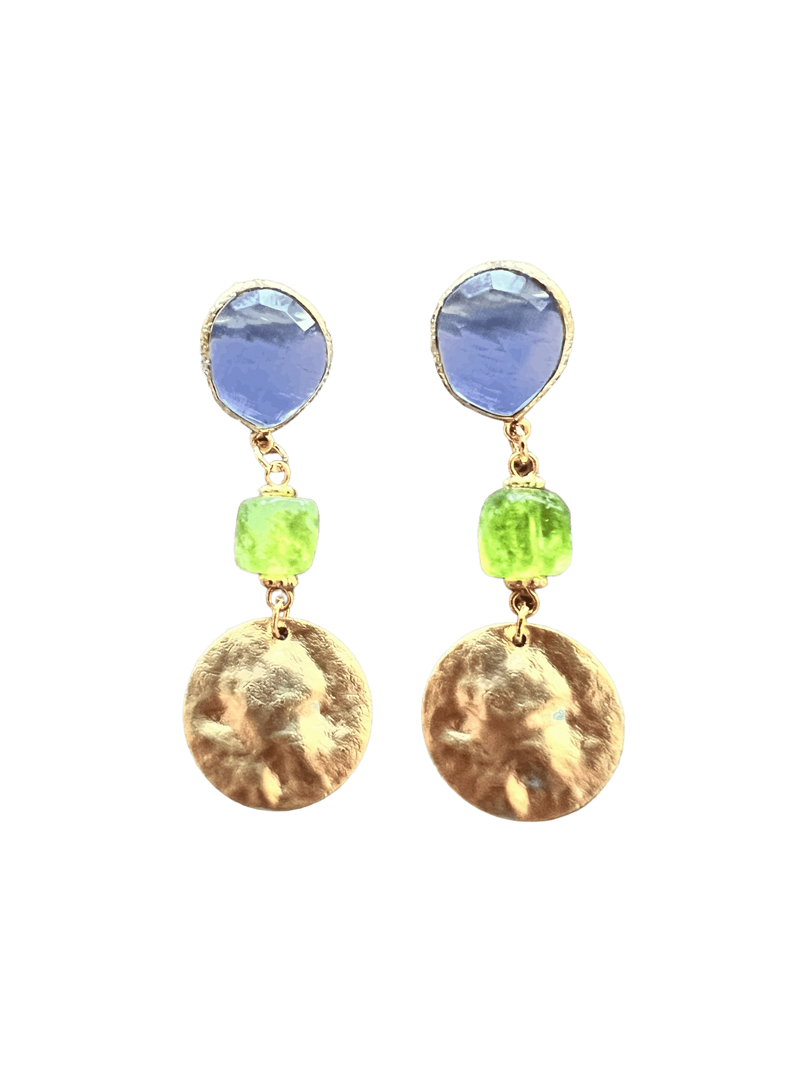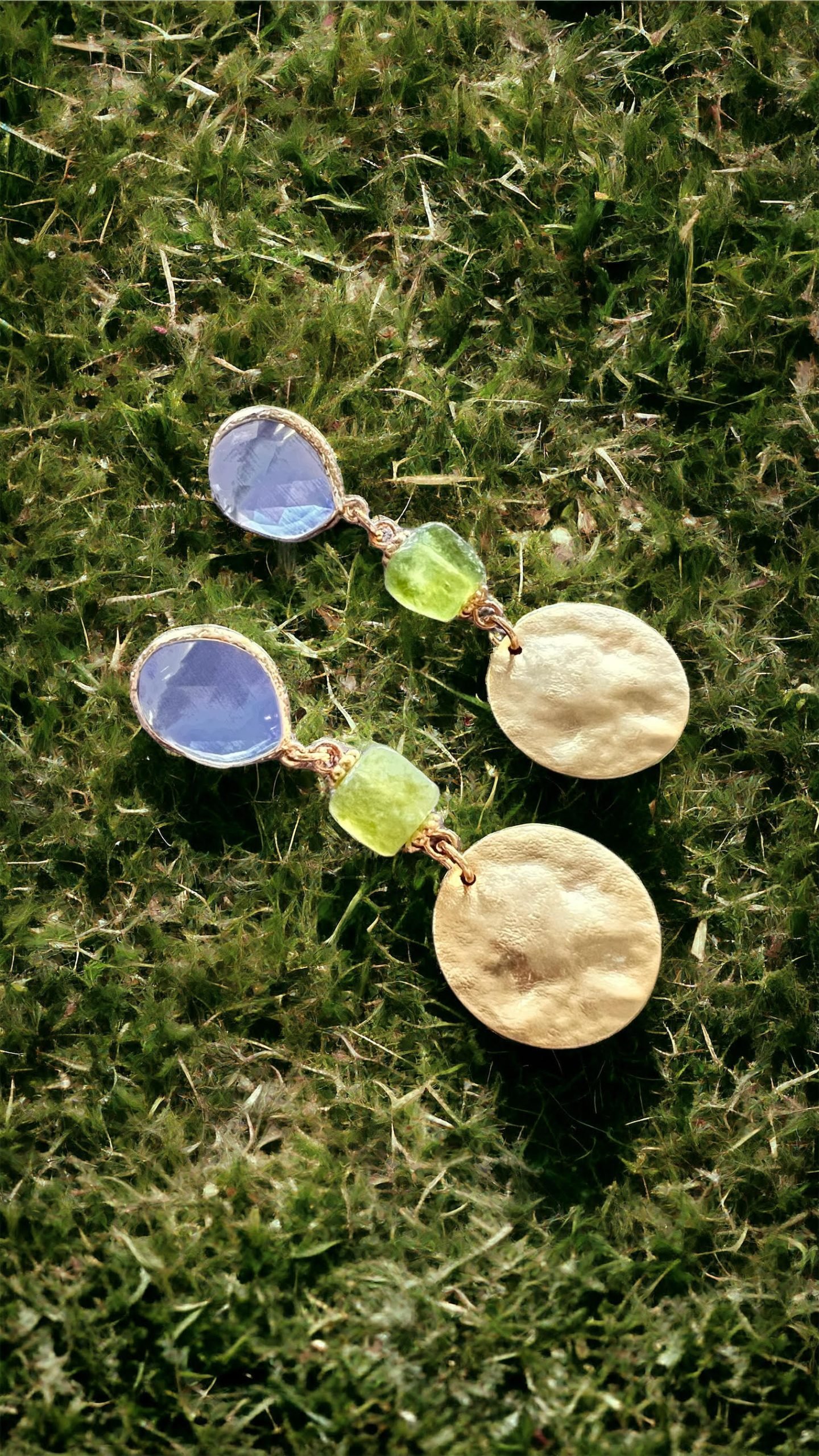 Laat de lente maar komen met deze prachtige lichtgewicht set van Folie à Jolie! Mooie goldplated oorstekers met ijsblauwe catseye, gecombineerd met appeltjesgroene jade en goldplated muntjes.