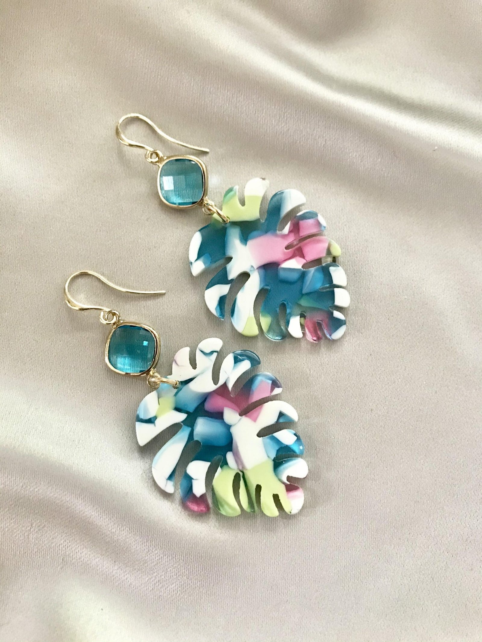 Vergulde oorhaakjes met een aquablue glassteentje en resin leaves in een mix van off-white, aquablue, roze en appeltjesgroen.