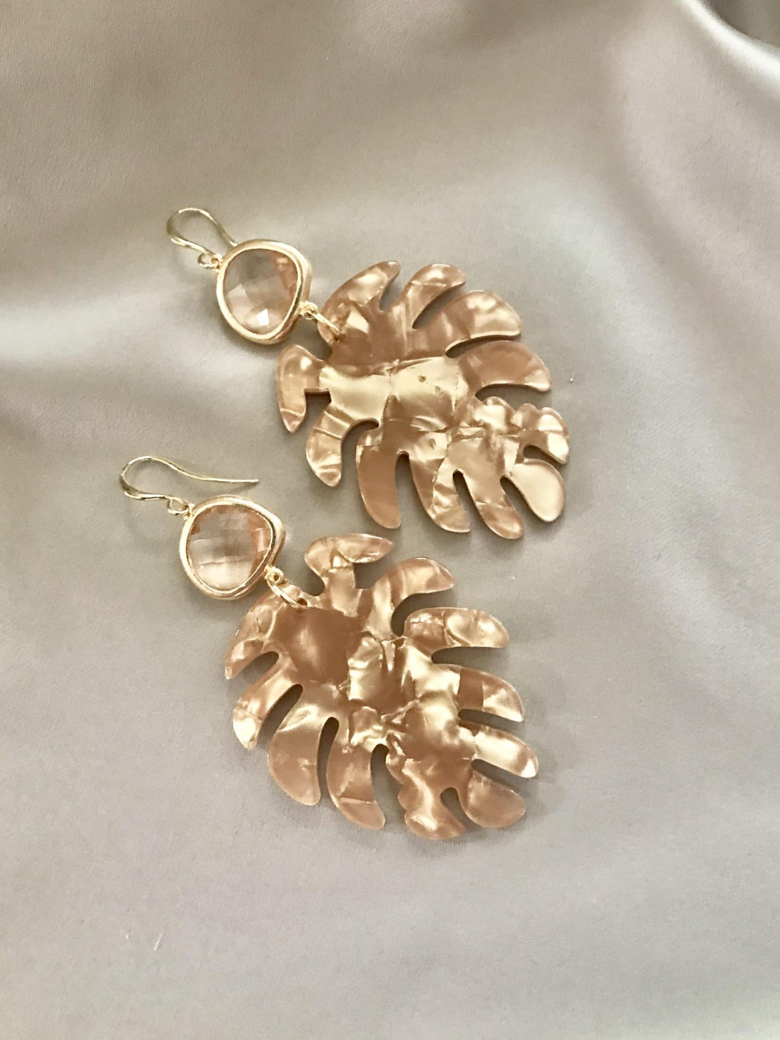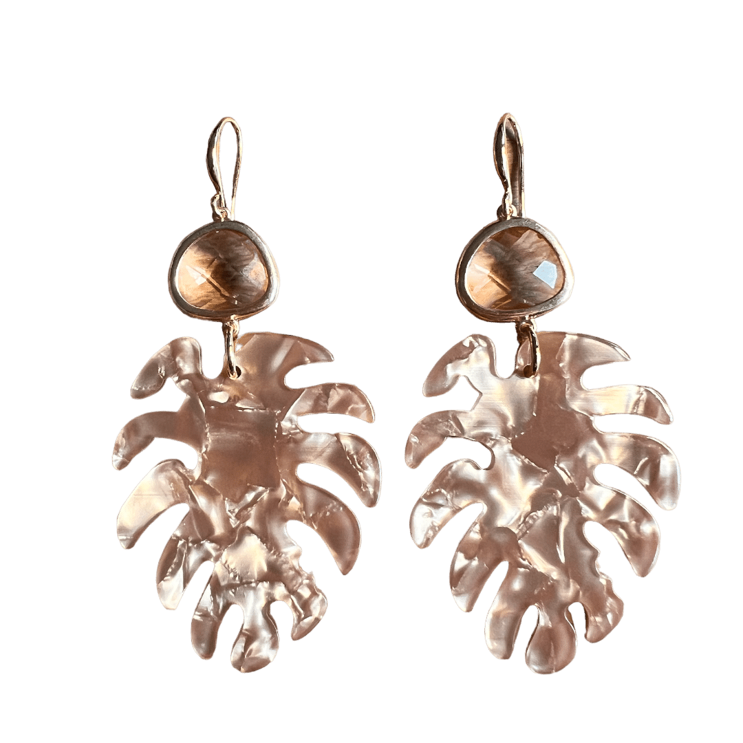 Vergulde oorhaakjes met peach glassteentjes en mooie gemêleerde leaves in een medium formaat in een goudbruine kleur. Ze passen overal bij!