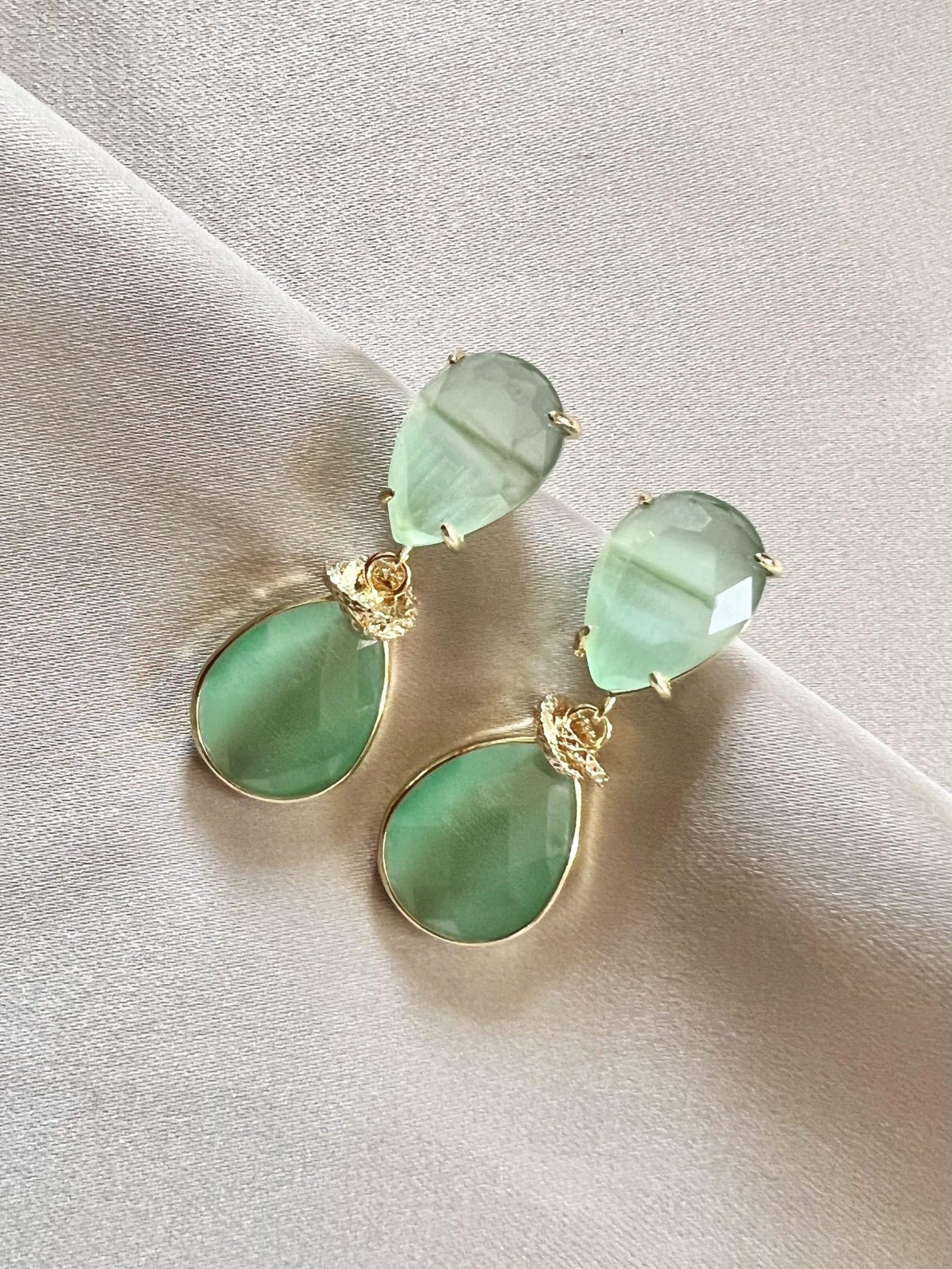 Goldplated mint catseye oorstekers gecomnineerd met catseye aquagroene drops, afgewerkt met goldplated materialen.