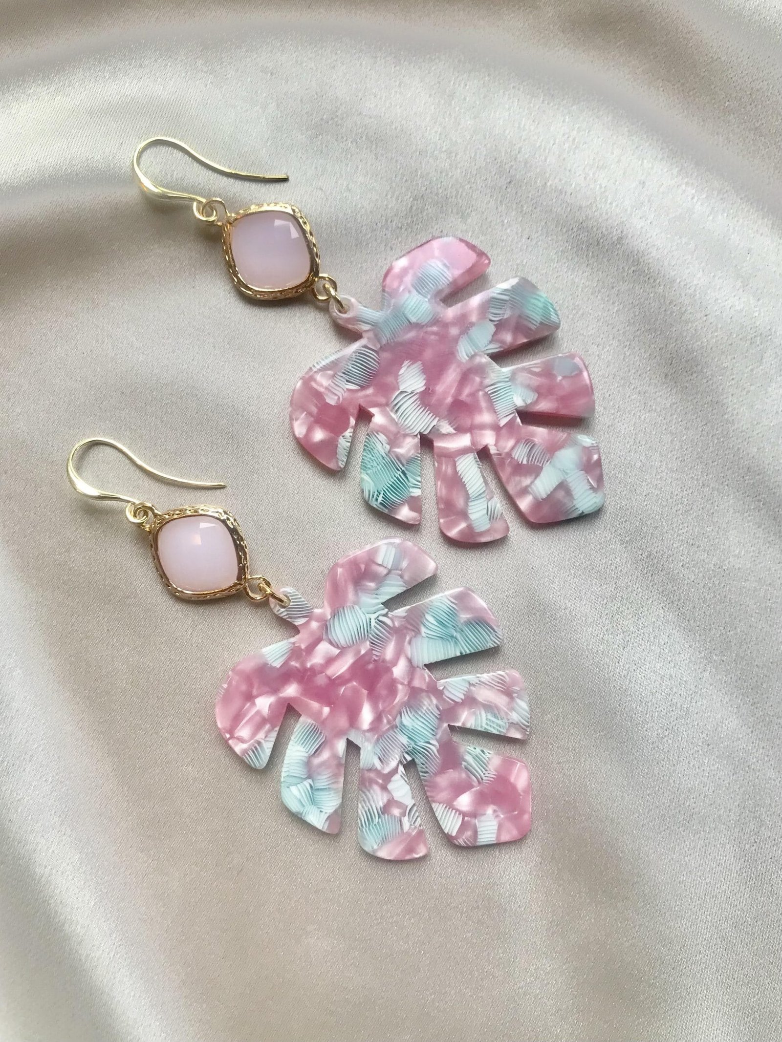 Vergulde oorhaakjes met snoepjesroze jade en resin leaves in het roze en mint.