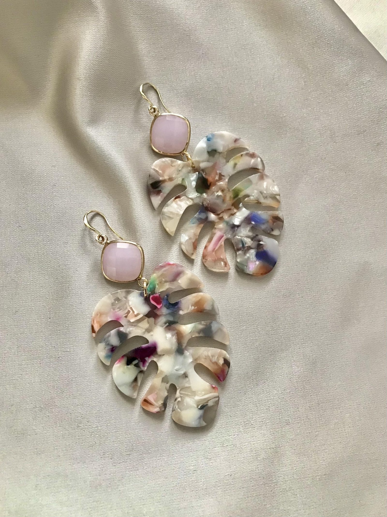 Vergulde oorhaakjes met snoepjesroze jade en leuke multi-colour leaves. Dit zijn echte statement oorbellen die nog steeds licht dragen!