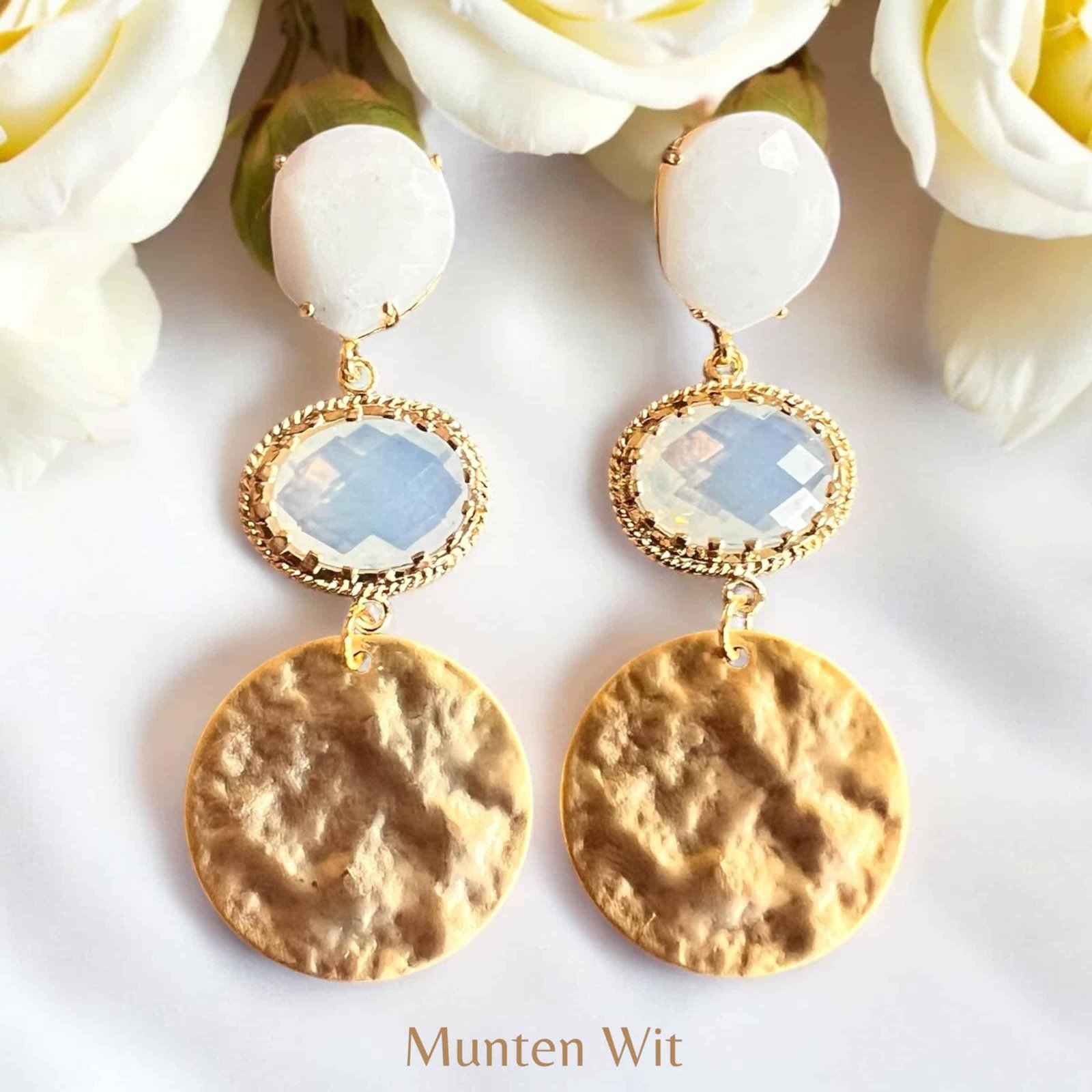 Witte natuurstenen goldplated oorstekers met goldplated facetgeslepen glasstenen in clear white gecombineerd met mooie goldplated munten. De set draagt heerlijk licht aan het oor.
