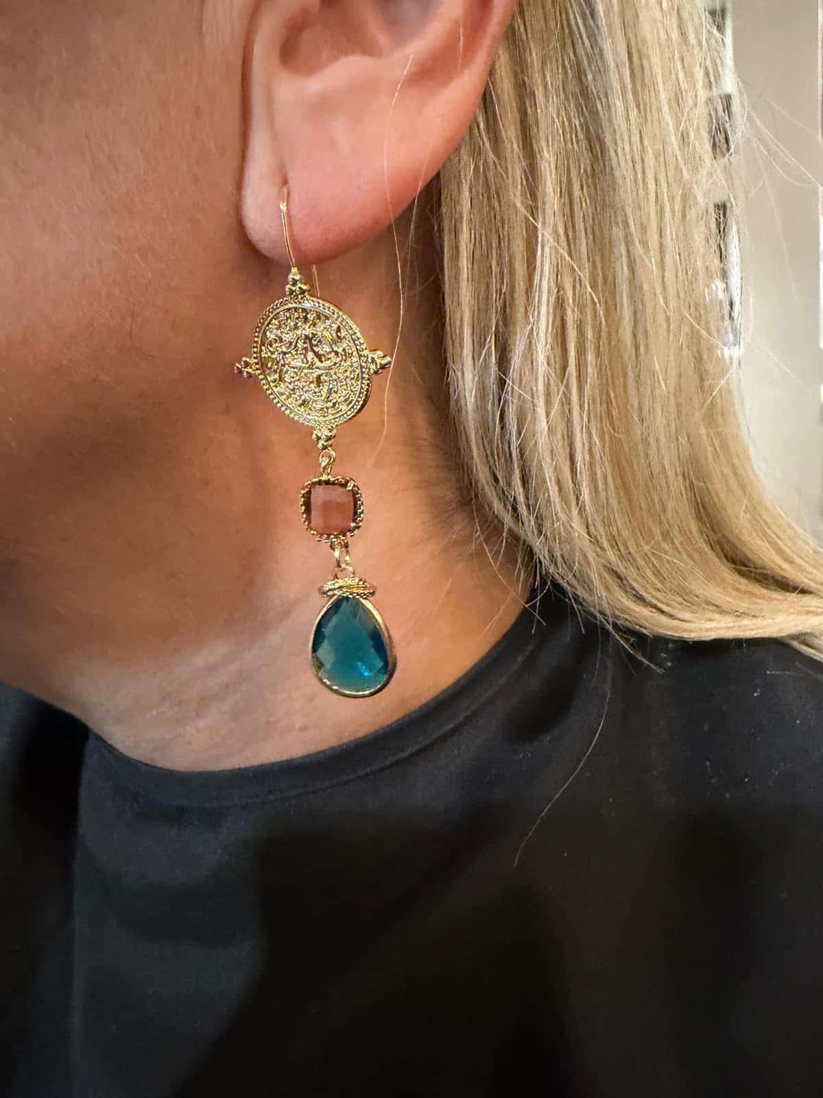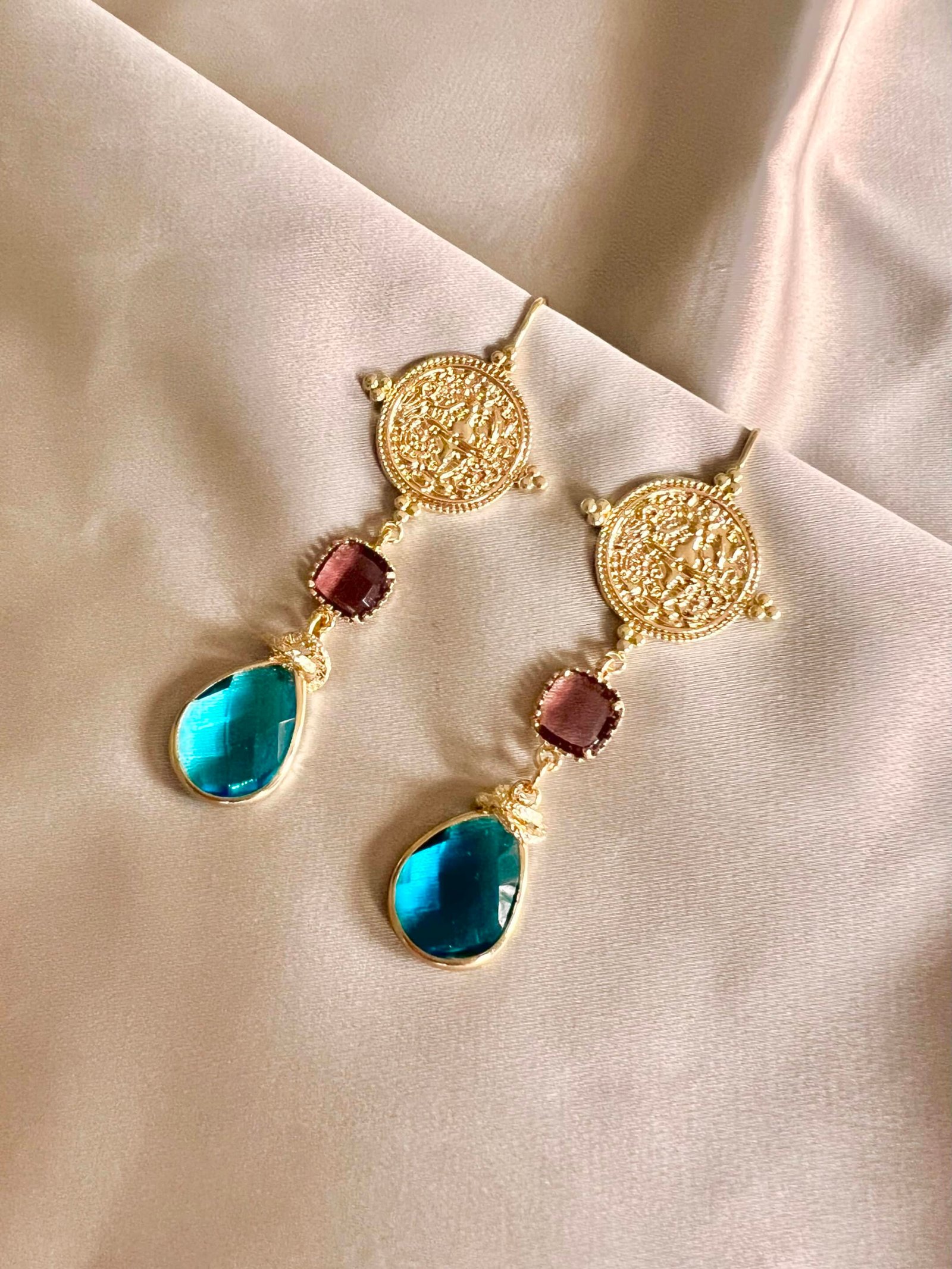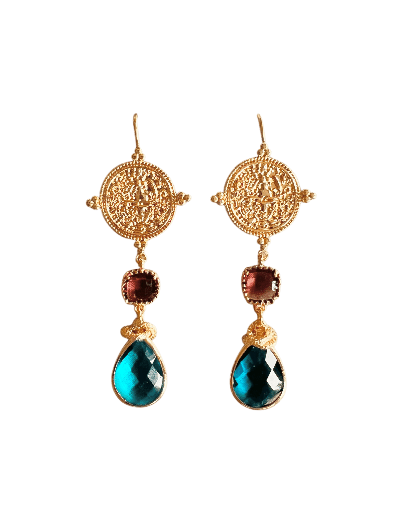 Een elegante mix van kleur en finesse: deze oorbellen combineren chique goldplated muntjes met oorhaken en schitterende glasstenen in burgundy en petrol. De warme goudtint maakt de kleuren extra luxe en opvallend.