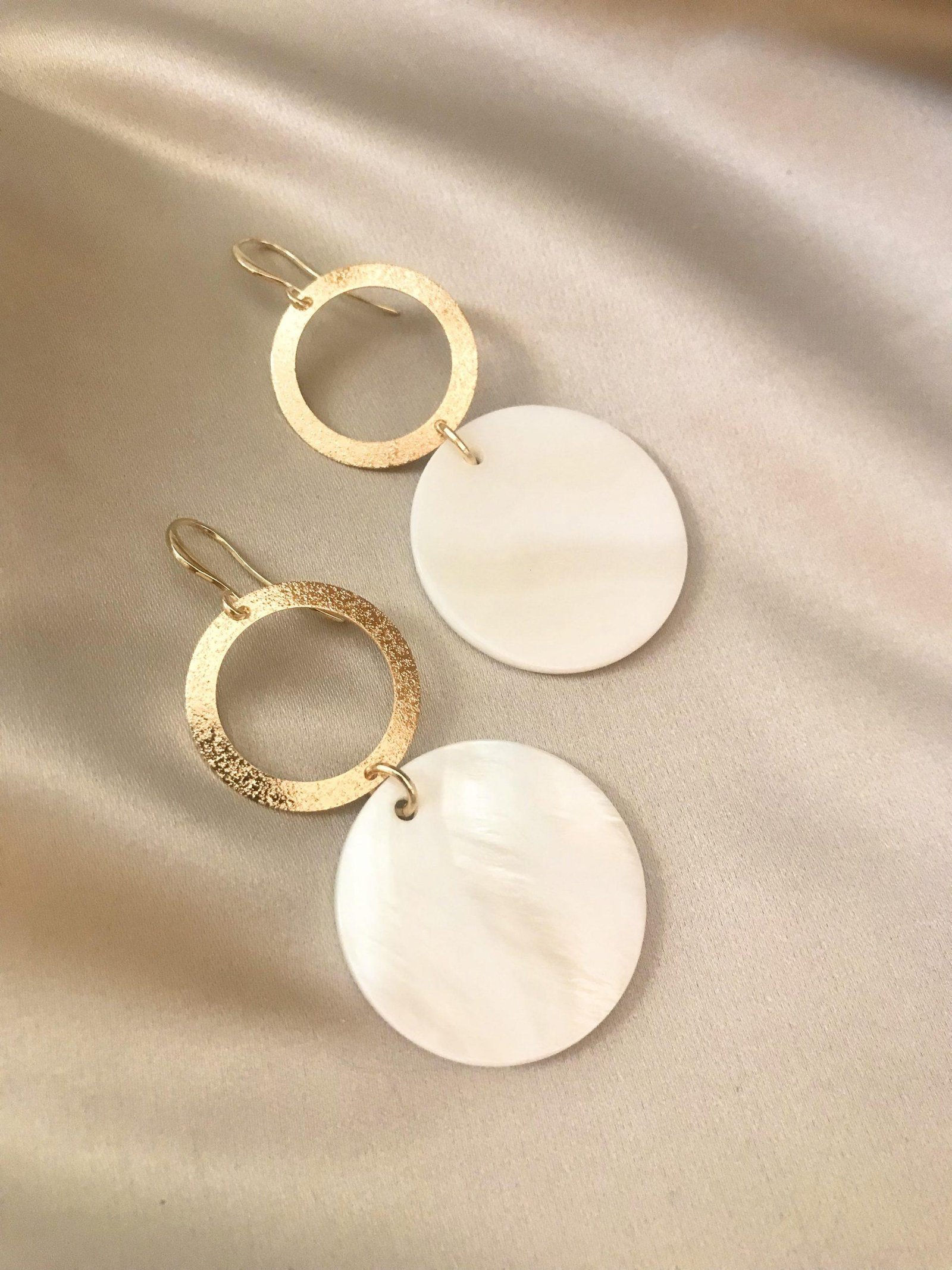 Vergulde oorhaakjes met brushed goudkleurige ringen en ronde witte hangers van natuurlijke schelp.