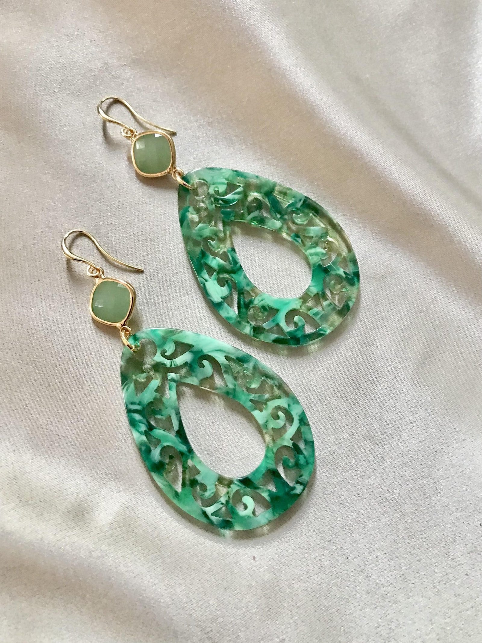 Vergulde oorhaakjes met lindegroene jade en leuke opengewerkte groene resin hangers. De hangers zijn gemêleerd, wat voor een speels effect zorgt! Ze dragen heerlijk licht aan het oor.