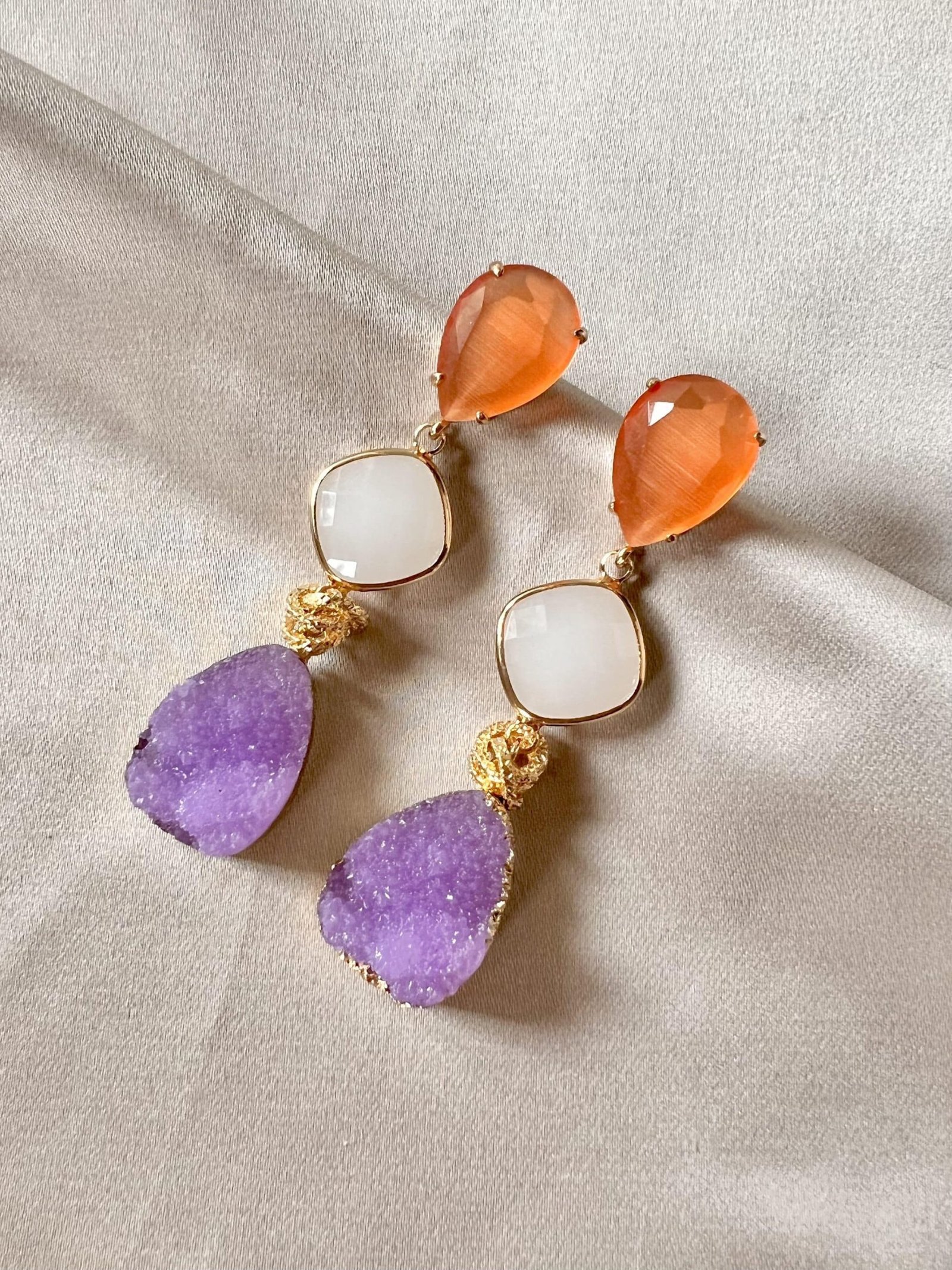 Mooie nieuwe eyecatchers van Folie à Jolie! Oranje catseye oorstekers (goldplated) met poederwitte jade en lila druzy stone. Ze dragen licht aan het oor, ook zo fijn!