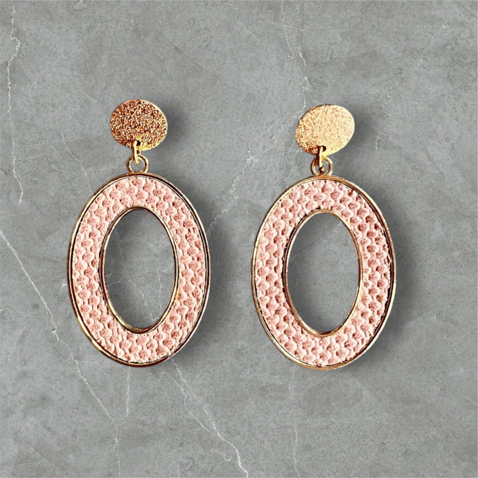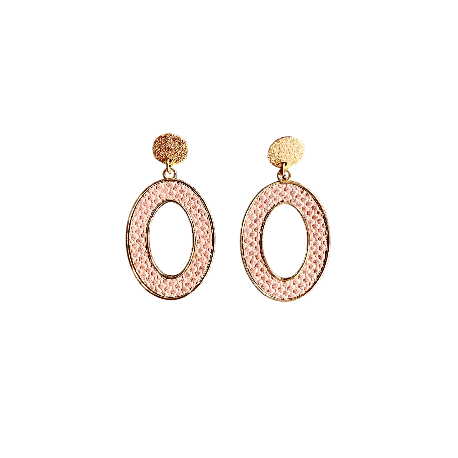 Goldplated oorstekers met ovale leatherlook hangers in de kleur oudroze. In de hangers zit een speels reliëfje.
