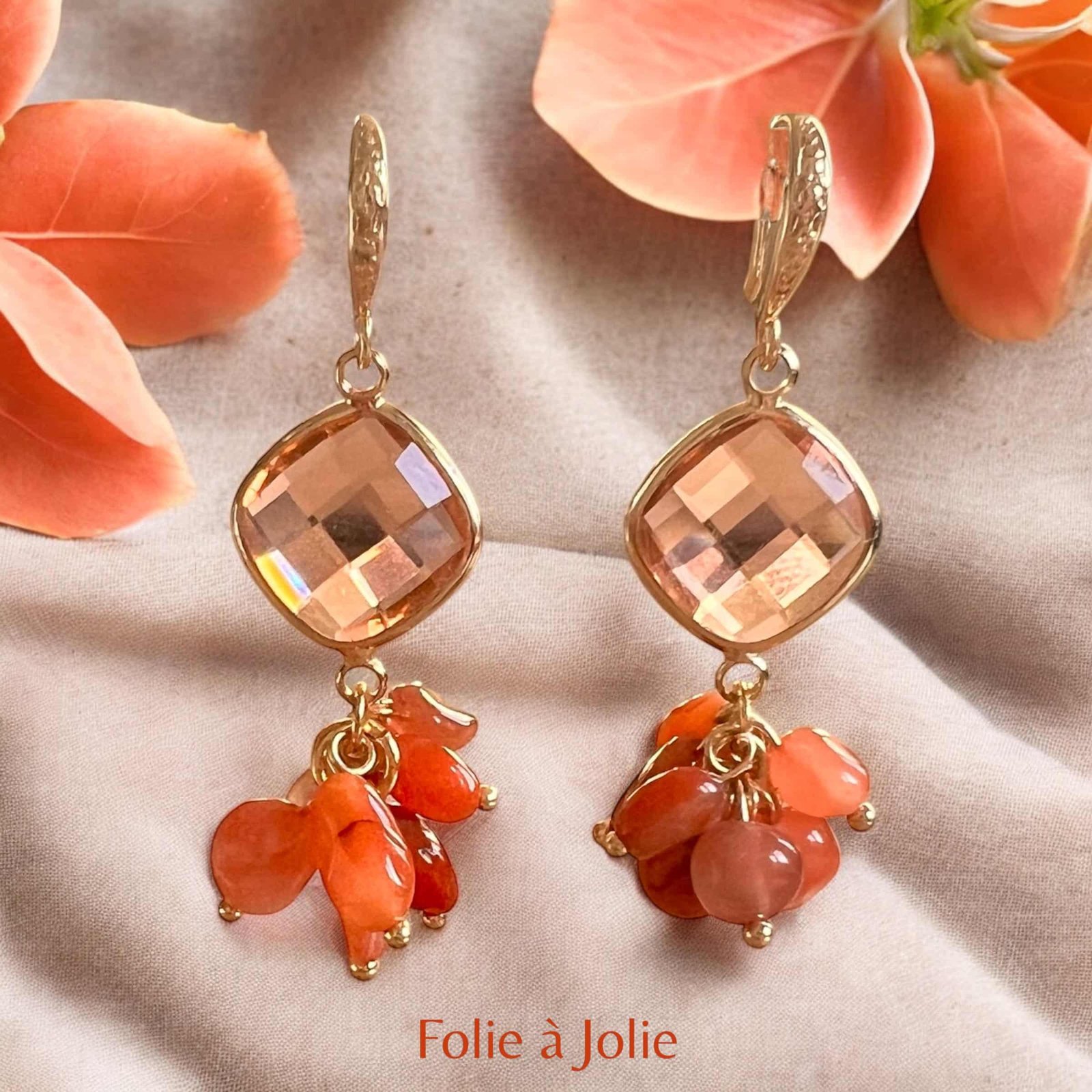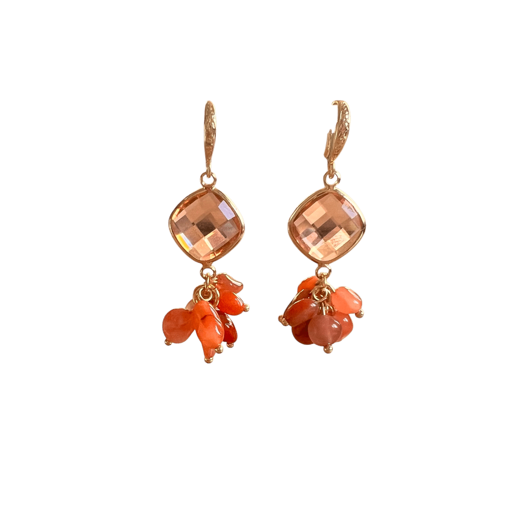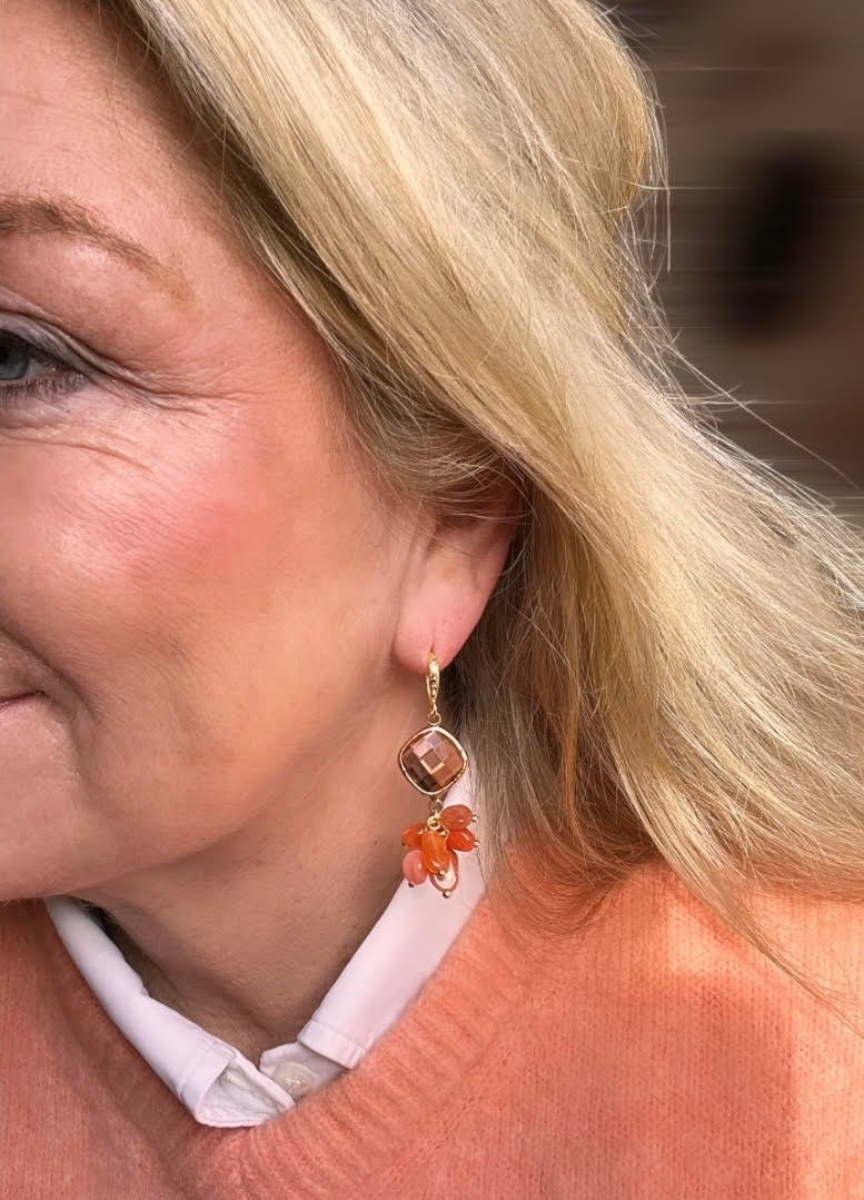 Mooie kwaliteit goldplated oorhaakjes met goldplated peach glasstenen, gecombineerd met peachkleurige natuursteentjes. De natuursteentjes verschillen per vorm en kleur, elke set is weer een beetje anders.