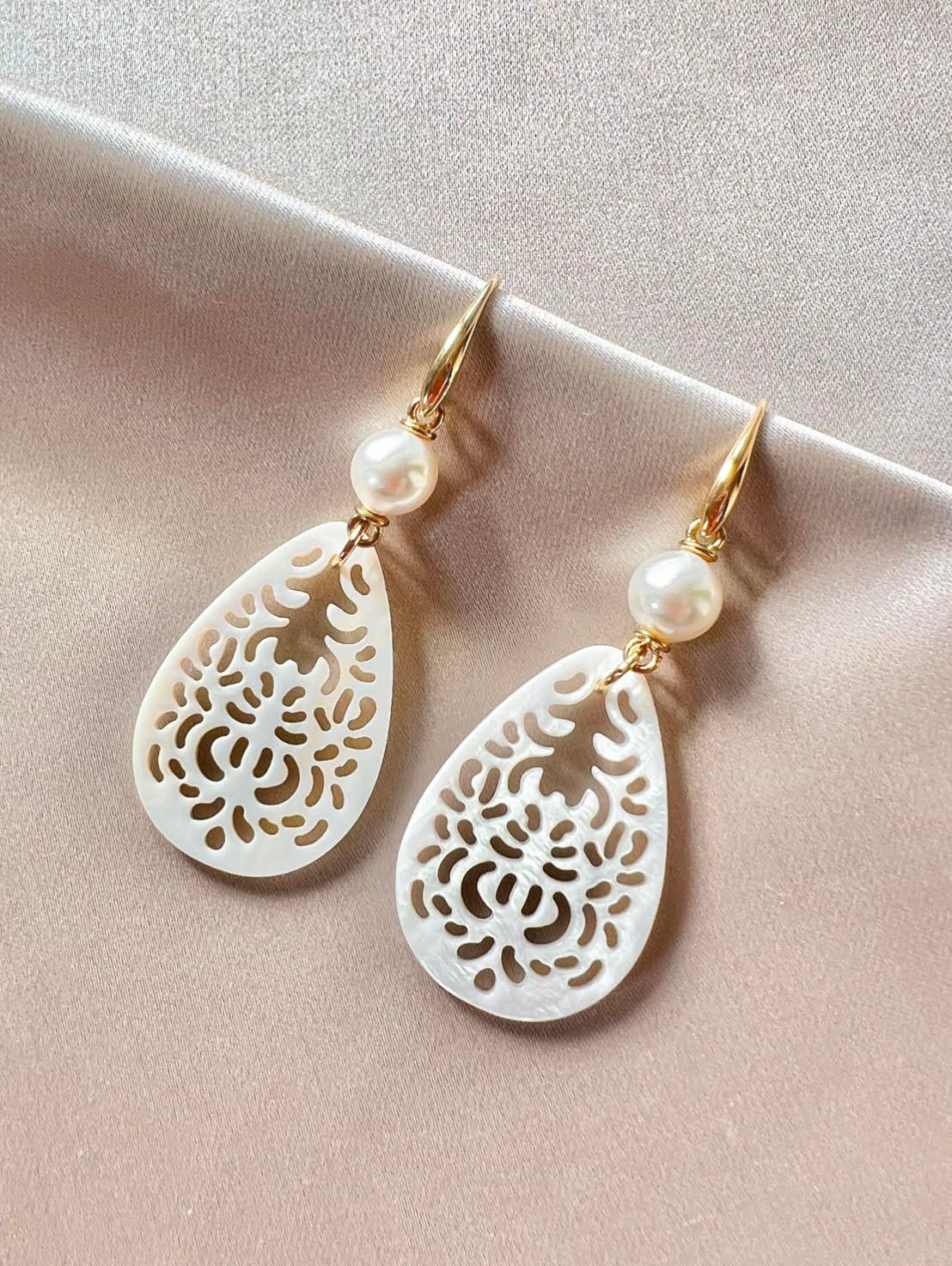 Goldplated oorhaakjes met goldplated parels en natuurlijke witte shell hangers. Een tijdloze set die heerlijk licht aan het oor draagt.