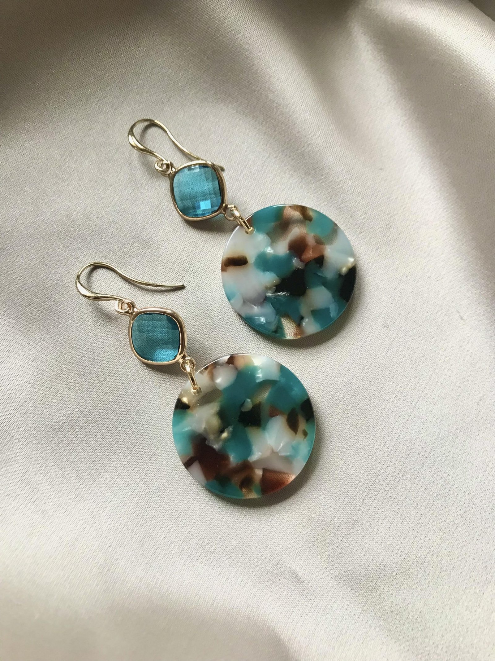 Vergulde oorhaakjes met petrol glassteentjes en leuke resin multicolour petrol hangers! Deze oorbellen dragen heerlijk licht aan het oor!