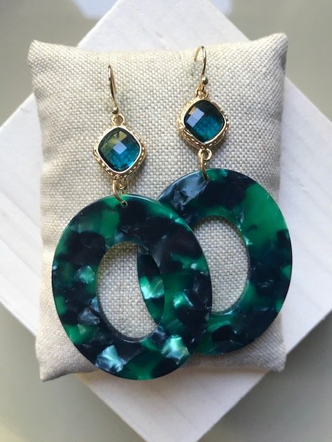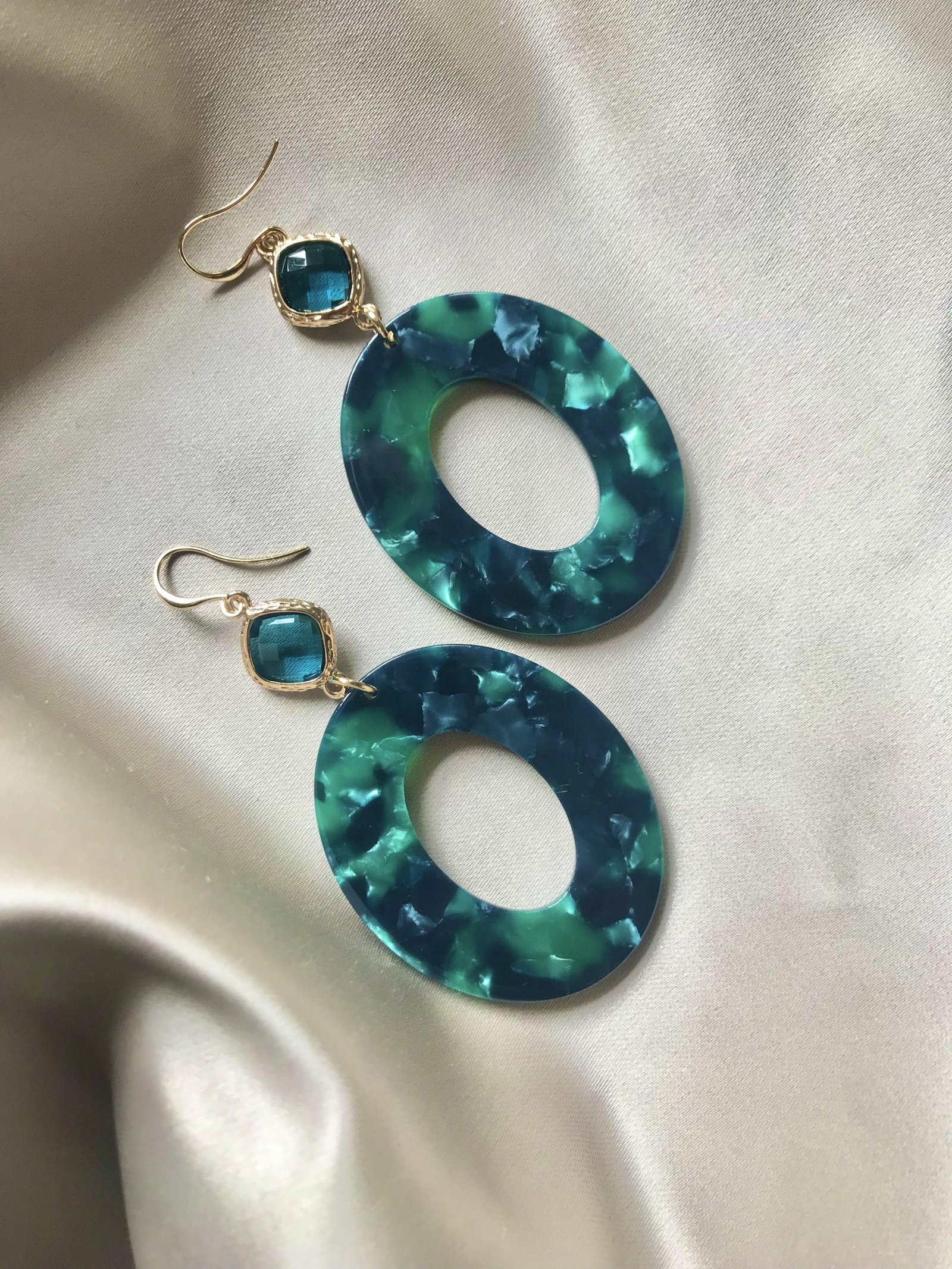 Vergulde oorhaakjes met petrol glassteentjes en donkergroene gemêleerde, resin hangers. Statement oorbellen die heerlijk licht dragen!